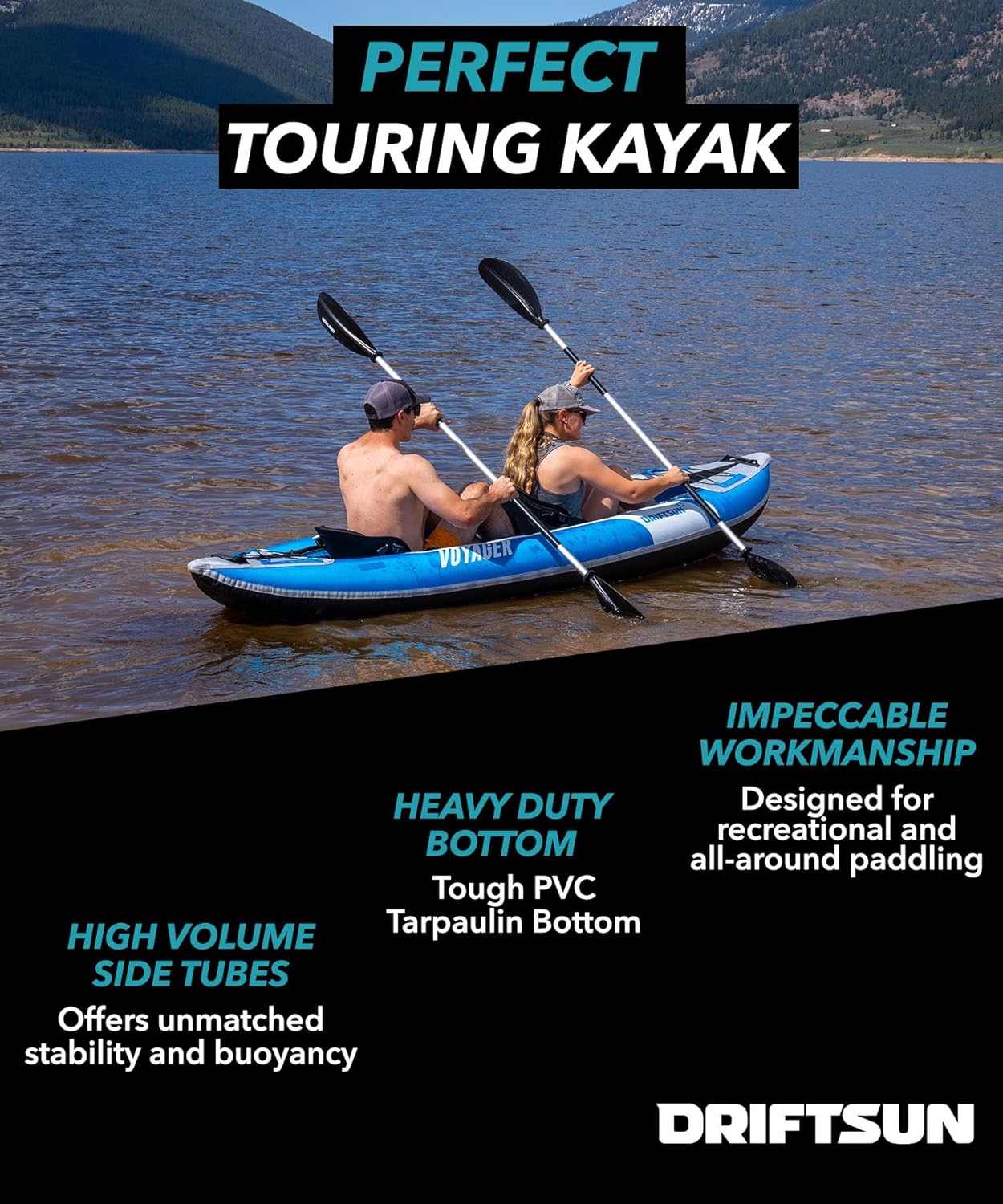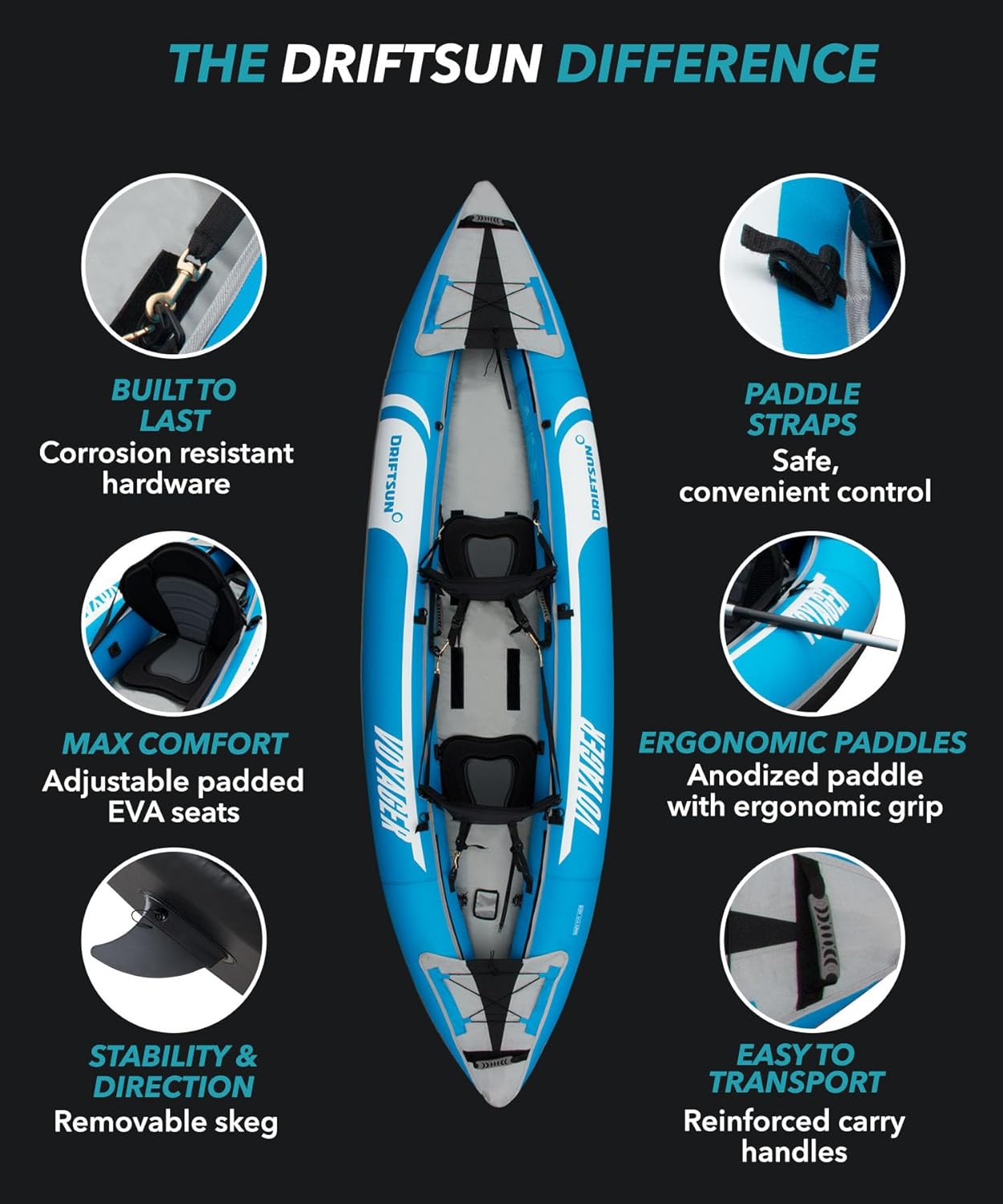 DURABLE DESIGN: Heavy-duty PVC Tarpaulin bottom provides durable protection from punctures, making the Driftsun inflatable tandem kayak the prefect companion for all your adventures. Double Threaded Boston valves are guaranteed not to leak, and tough 840D coated nylon oxford fabric top cover is rip and tear resistant.