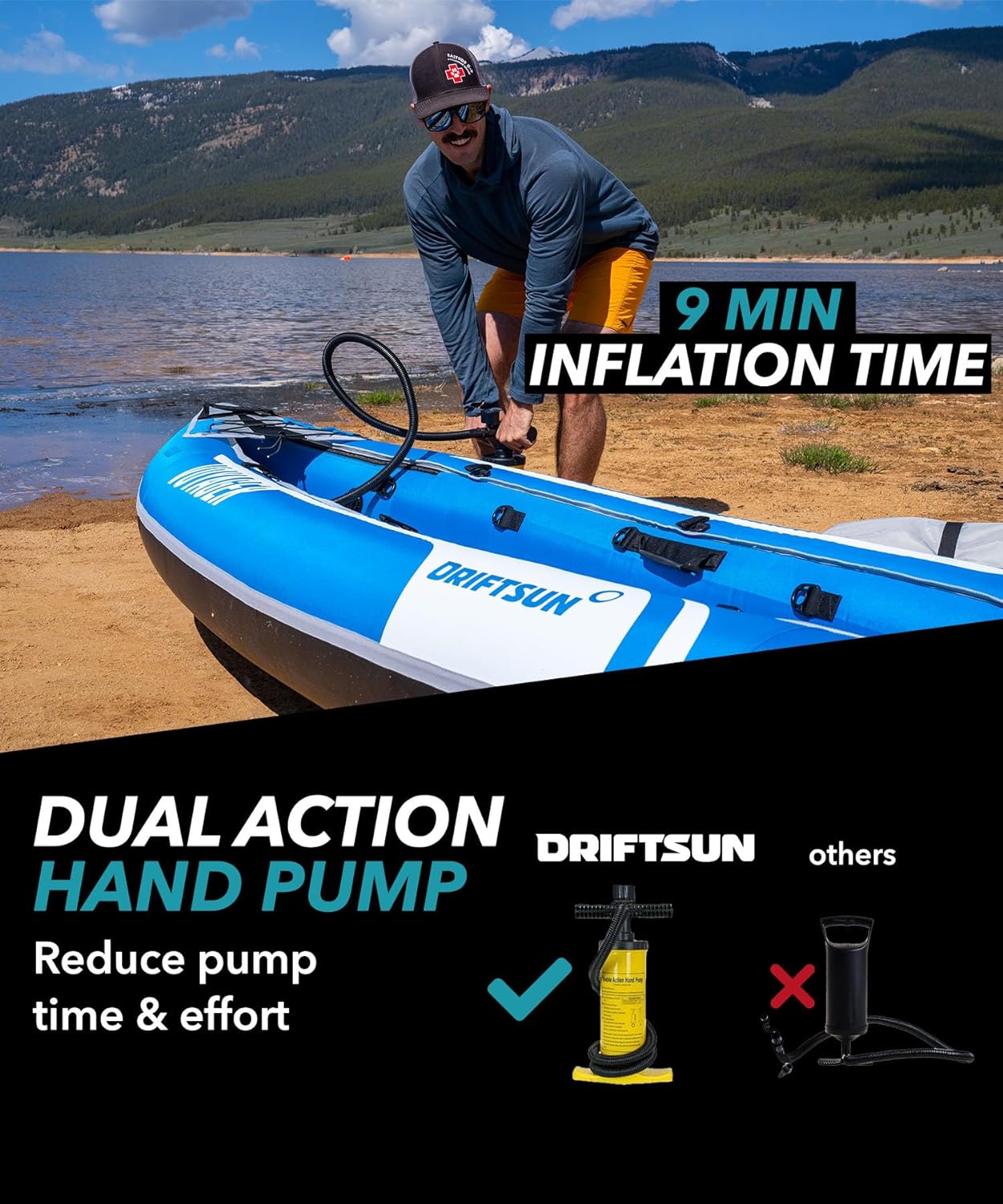 INFLATES QUICKLY: The Driftsun Voyager Tandem Kayak inflates to a full size kayak (10ft. x 35” x 16”) in less than 5 minutes with the included deluxe high flow double action hand pump. Go from garage, to trunk, to water in no time!