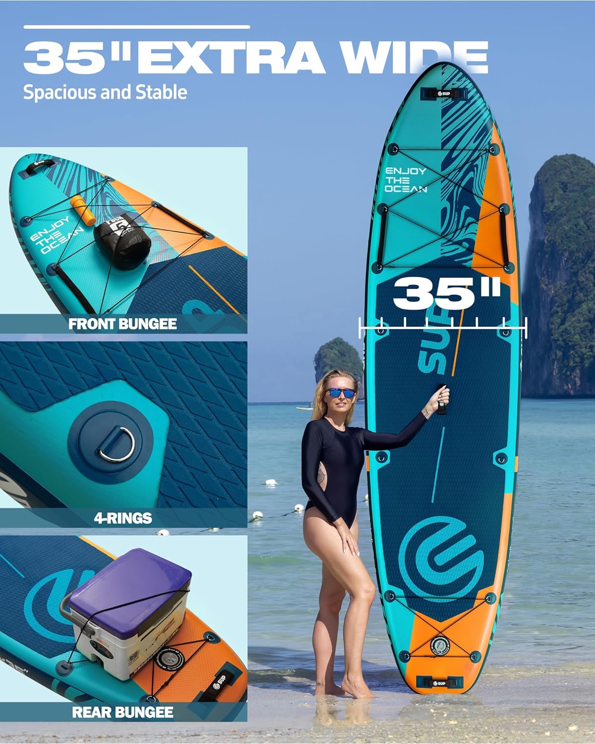 【ENHANCED SIZE & EXTRA STABLE】The extra wide paddle board is designed with an enhanced size of 11’6″*35″, providing you with a spacious and stable platform to enjoy your paddling experience. Maximum weight capacity up to 430 lbs. Whether you are a beginner or an experienced paddler, this sup offers excellent stability, allowing you to navigate various water conditions confidently.