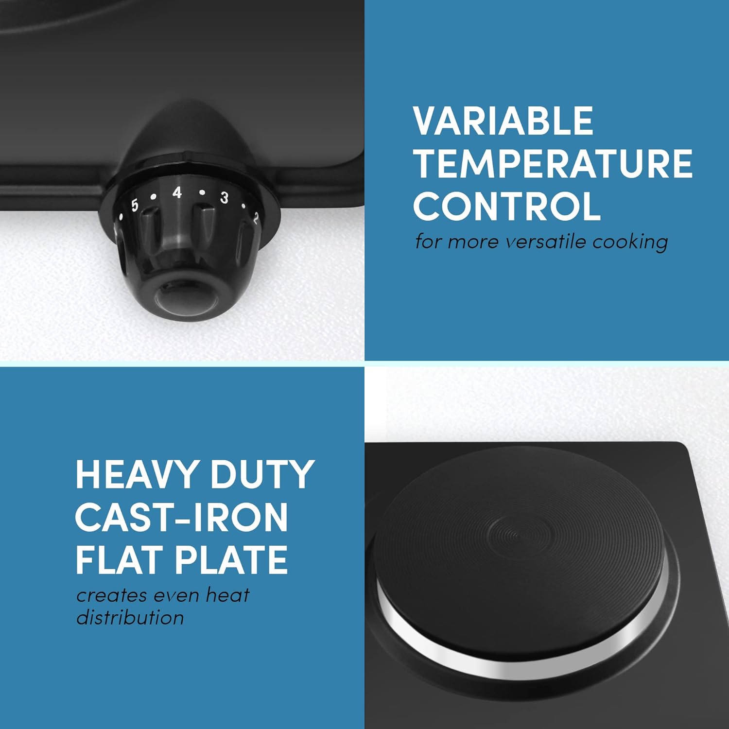 Efficient Power – With a wattage of 1000 Watts, the hot plate and individual temperature controls provides sufficient heat for all your cooking needs.