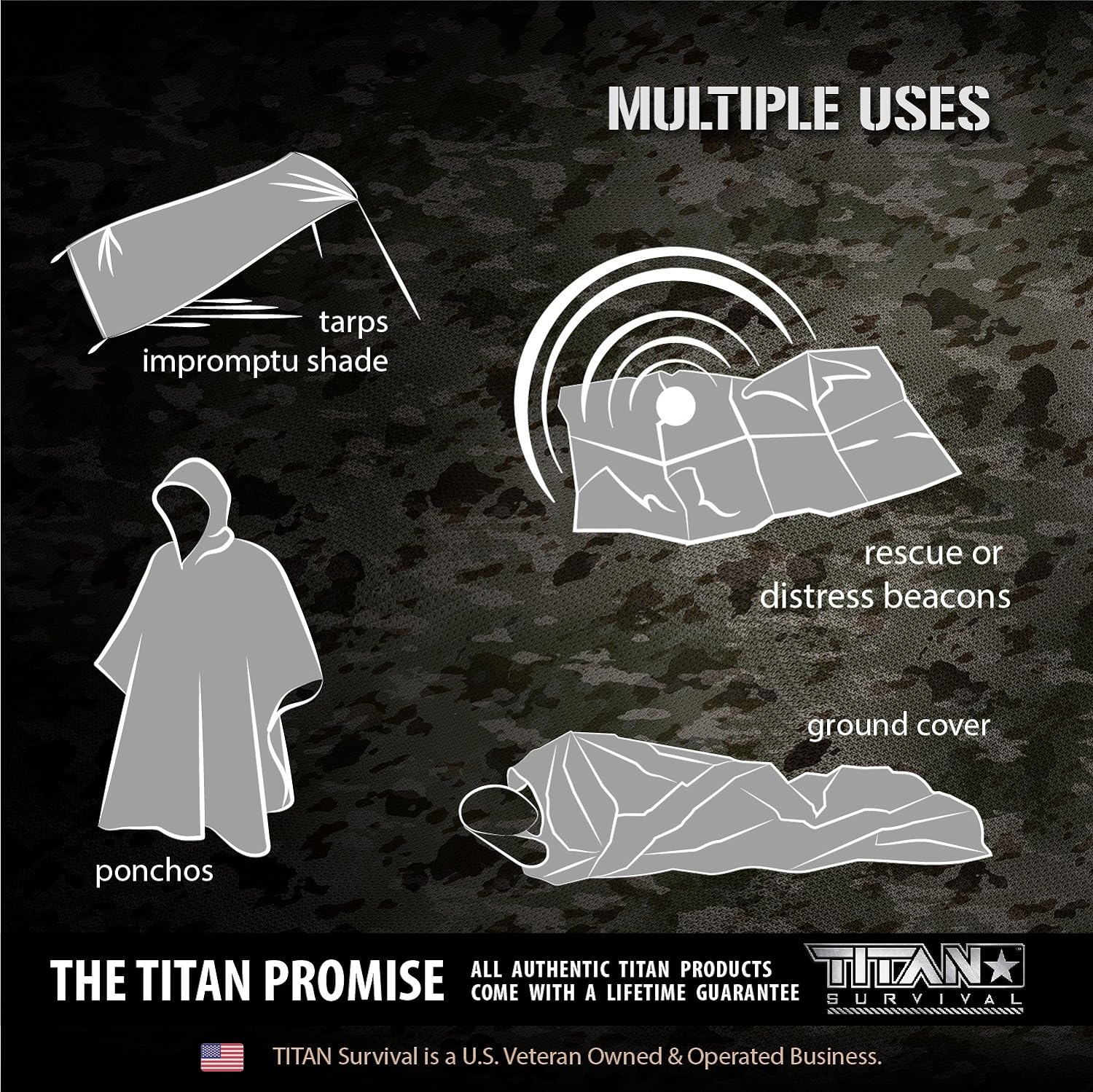 WOODLAND CAMO EMERGENCY BLANKET – Available only from TITAN, this 5-Pack of casualty emergency blankets features our exclusive patented Woodland SHROWD camouflage pattern on one side, and highly-reflective silver Mylar on the other.
