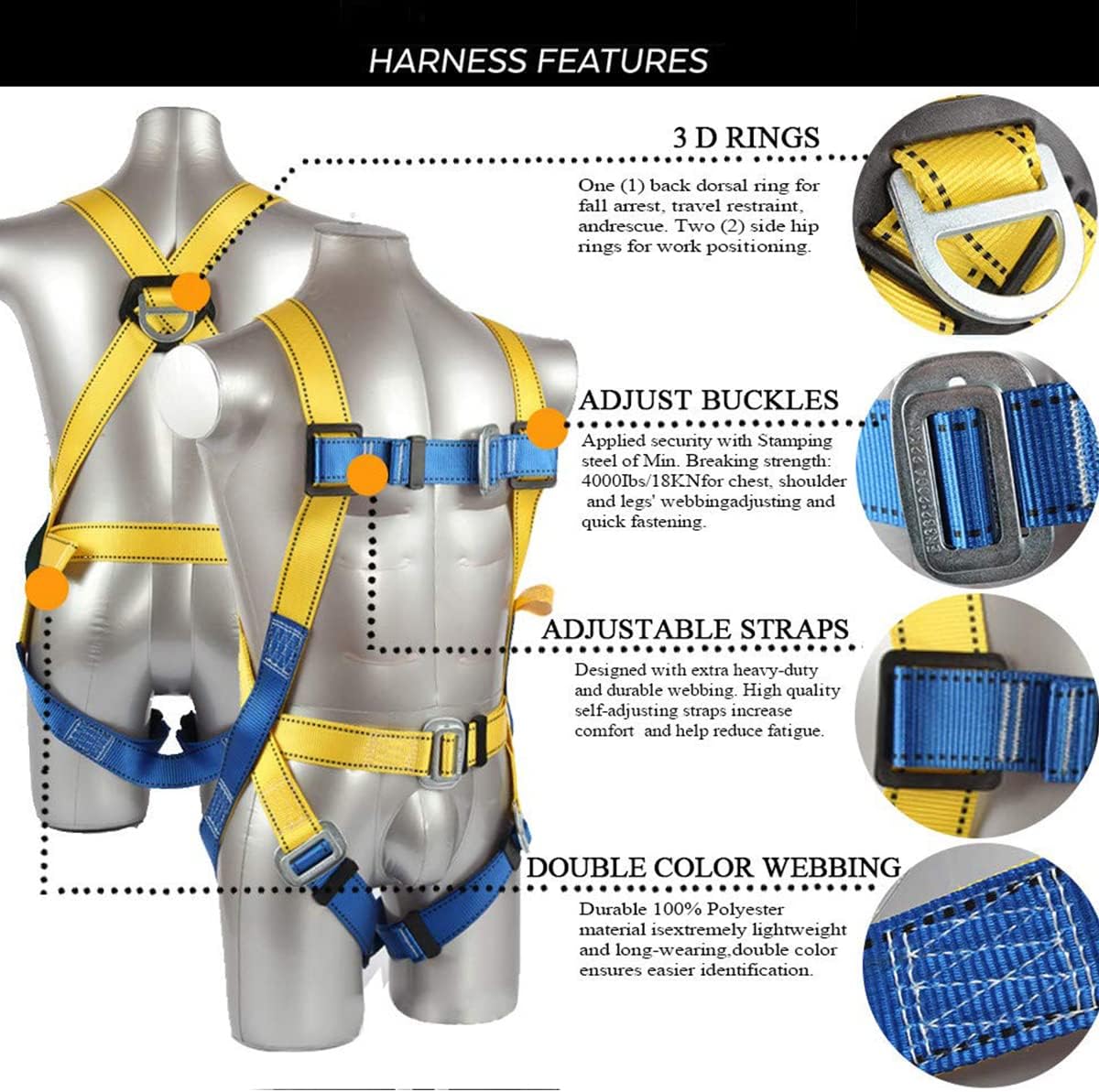 WARRANTY: All the Ymachray Full Body Harness Kit have the fully passed test report in accordance with ANSI/ASSE Z359.11-2014 & ANSI Z359.13-2013. ASTM F1774 Certified ,SAFE and GUARANTEED. 45 Days Money-Back & 2 Years Warranty, When You Are Not Satisfied with Our Product, Please Don’t Hesitate to Contact Us. BUY WITH CONFIDENCE.