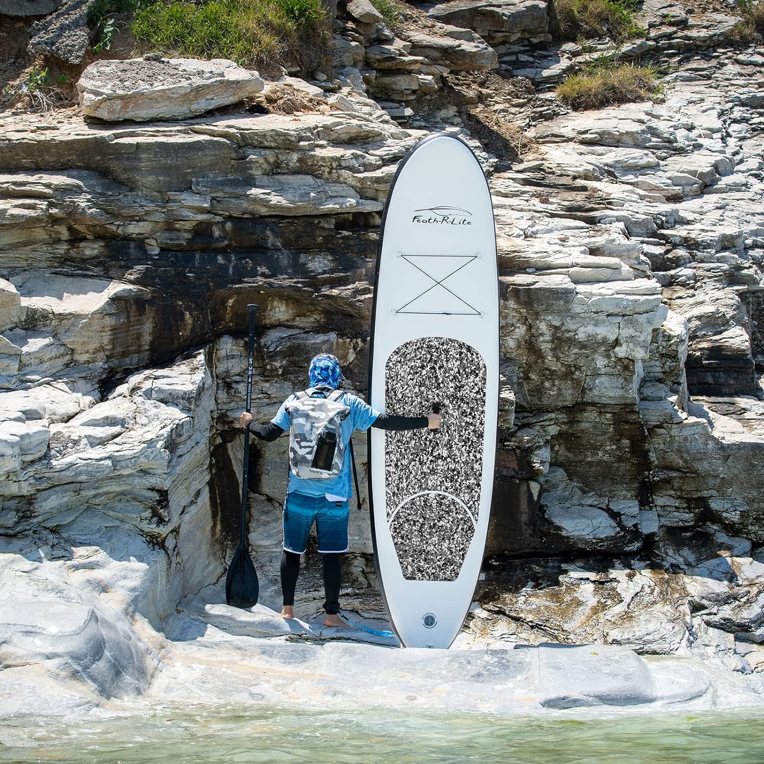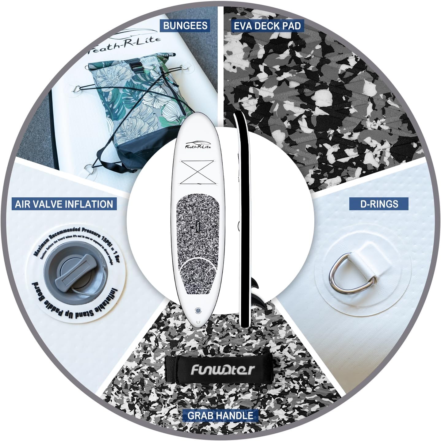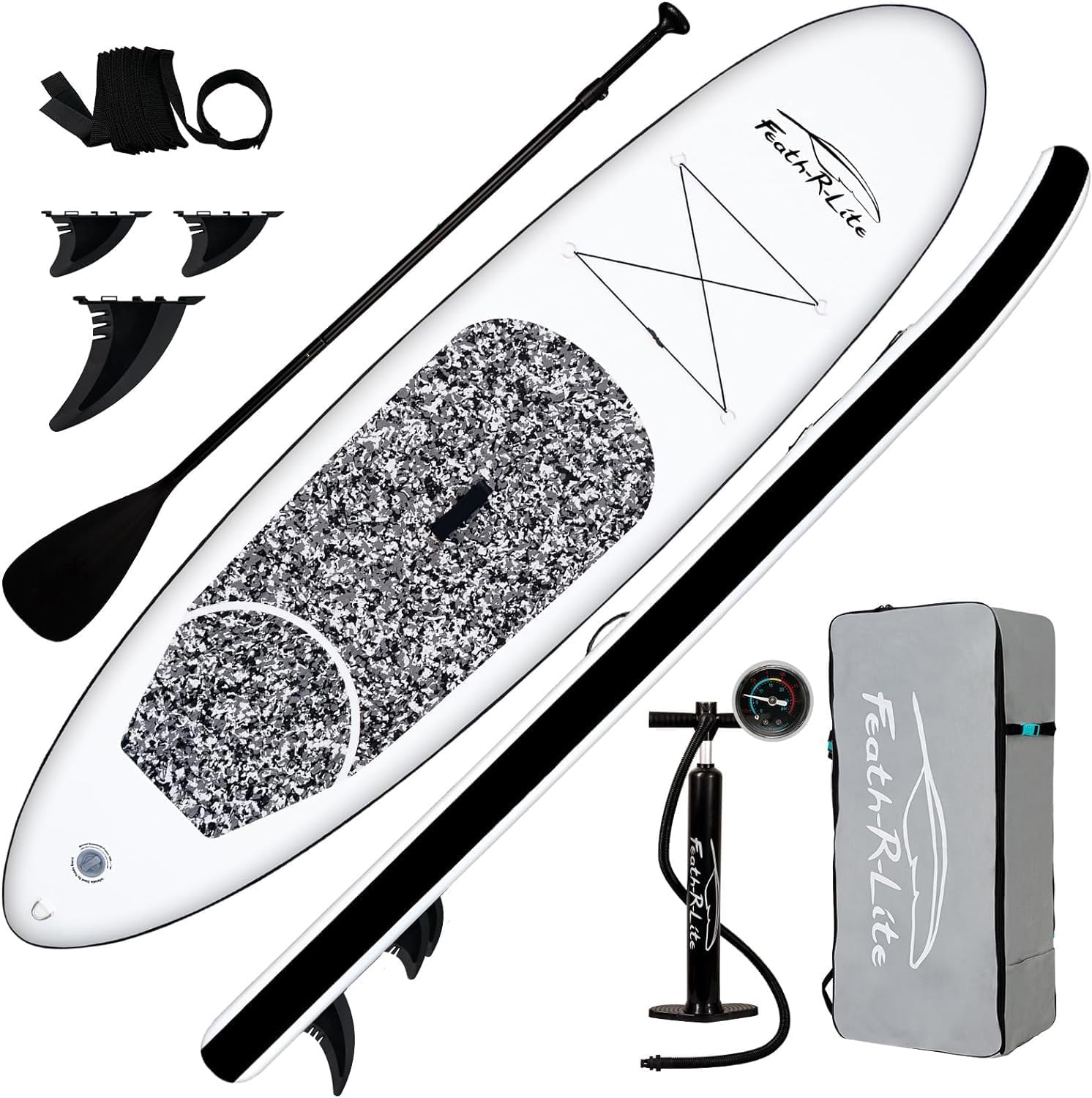 【Design and Use】FEATH-R-LITE’s unique ergonomic handle design allows you to inflate your paddle more easily in a shorter time. The sensitive barometer ensures that you can read the sup inflation pressure value (12-15psi) at any time. The multifunctional elastic string can tightly fix any objects placed on the inflatable paddleboard. The multipurpose and ultra-large backpack can help you easily carry the paddle to any of your dream places.