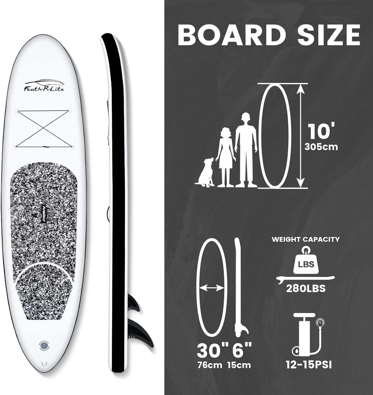 FEATH-R-LITE inflatable stand up paddle board , which features durable top foam and non-slip grip. This inflatable stand up paddle board use the new ultra-light construction is 35% lighter than comparable models. The board maximum capacity is up to 330 lbs, stable and great for all conditions. It is ideal for fit all skill levels, with its length and proportion the board can provide excellent glides for cruising, fitness, fishing, and exploring. Performs like a hard board riding a rigid inflatable SUP will make you feel like you’re on a hard board without compromising stability or performance. The added benefits make FEATH-R-LITE paddle board a great option for beginners and tandem riders alike.