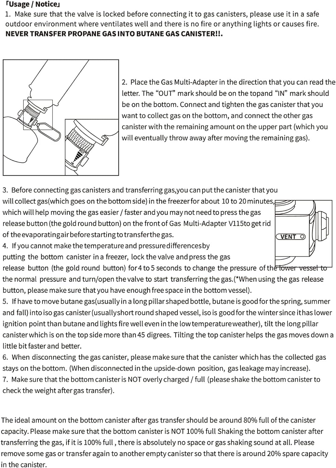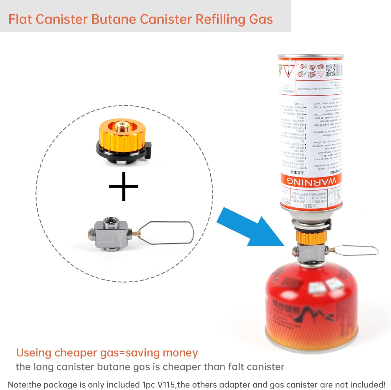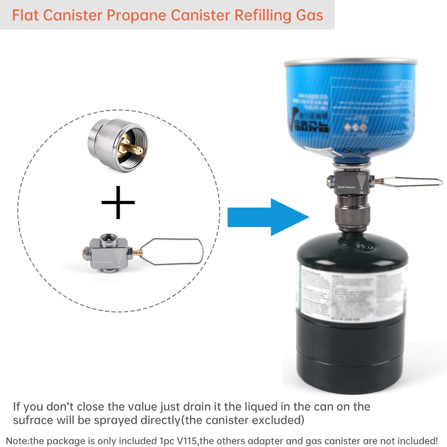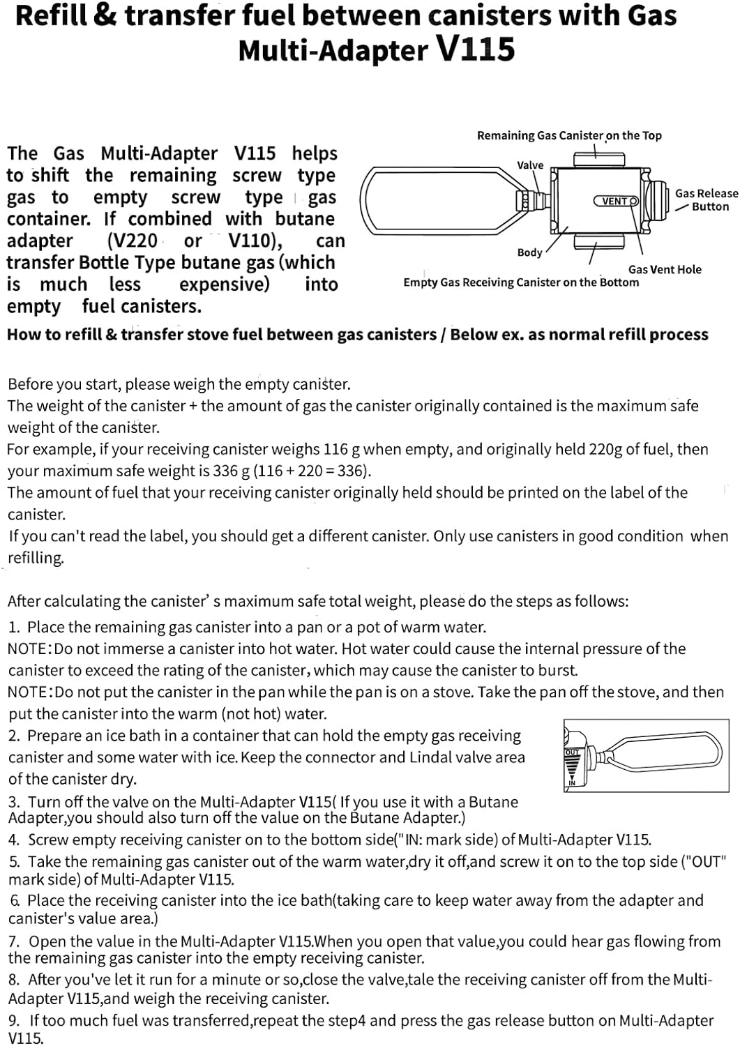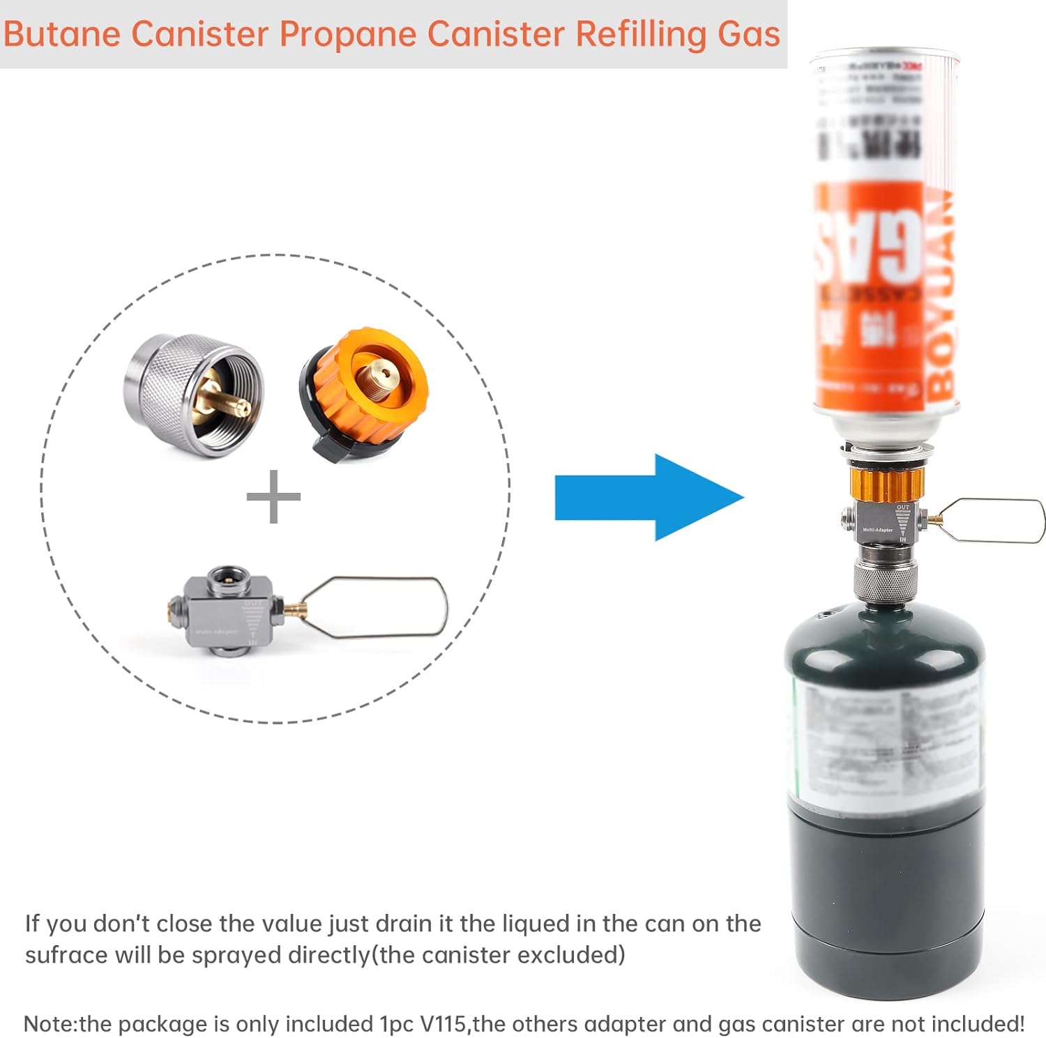 Multifunction:The Canister refill adapter save fuel and save resources by collecting remaining gas.It can refill gas from isobutane fuel canister( EN417 Lindal Valve) to another isobutane canister.Comebine with butane adapter(V110)It can use the cheaper gas such as 8oz butane gas cartridge(nozlle bottle).Comebine with Propane adapter(V220)It can use the cheaper gas such as16oz small proppane tank.