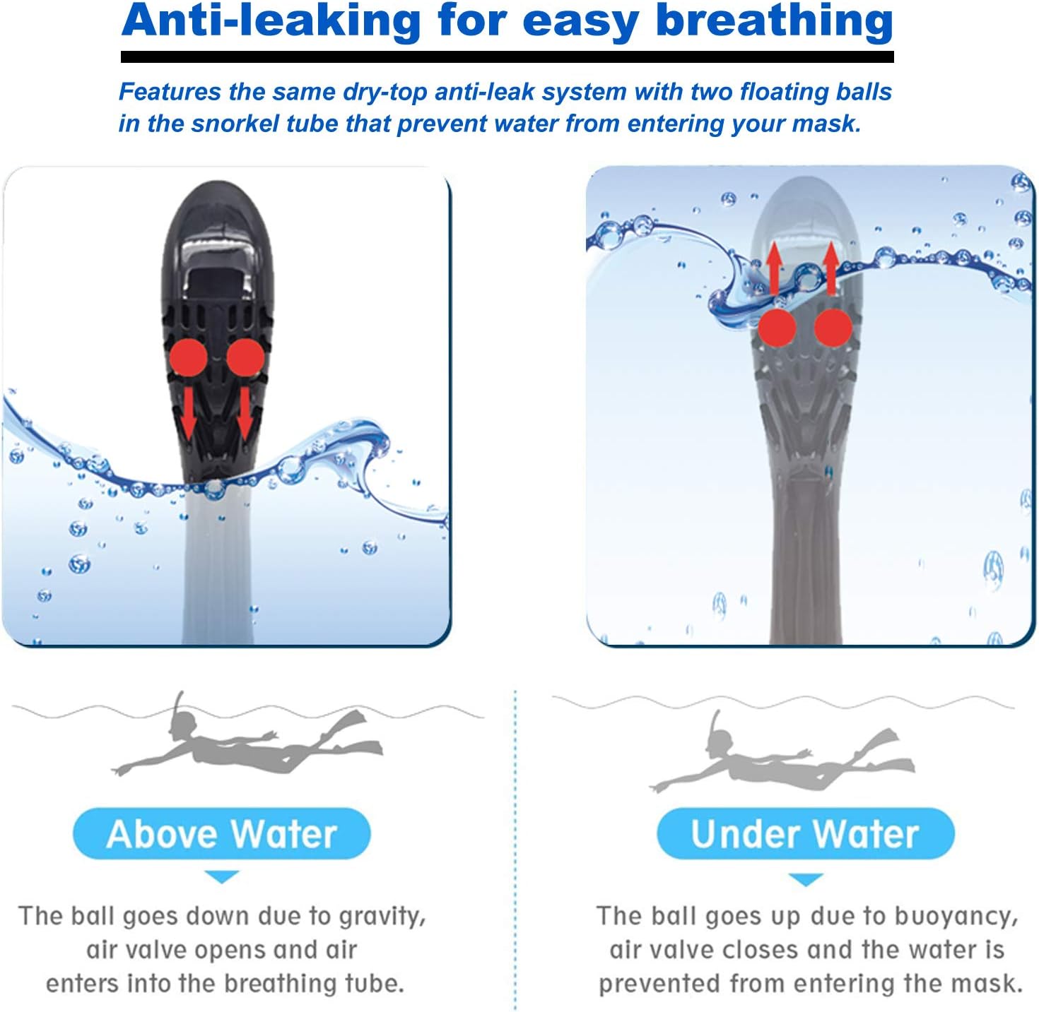 THE LATEST SAFETY BREATHING MECHANISM – Fresh air enters the snorkel mask from the breathing tube, and carbon dioxide is discharged from both sides of the face. The air inlet channel and the air outlet channel are separated from each other. Exhaust gas does not flow back, and breathing is smoother and healthier.