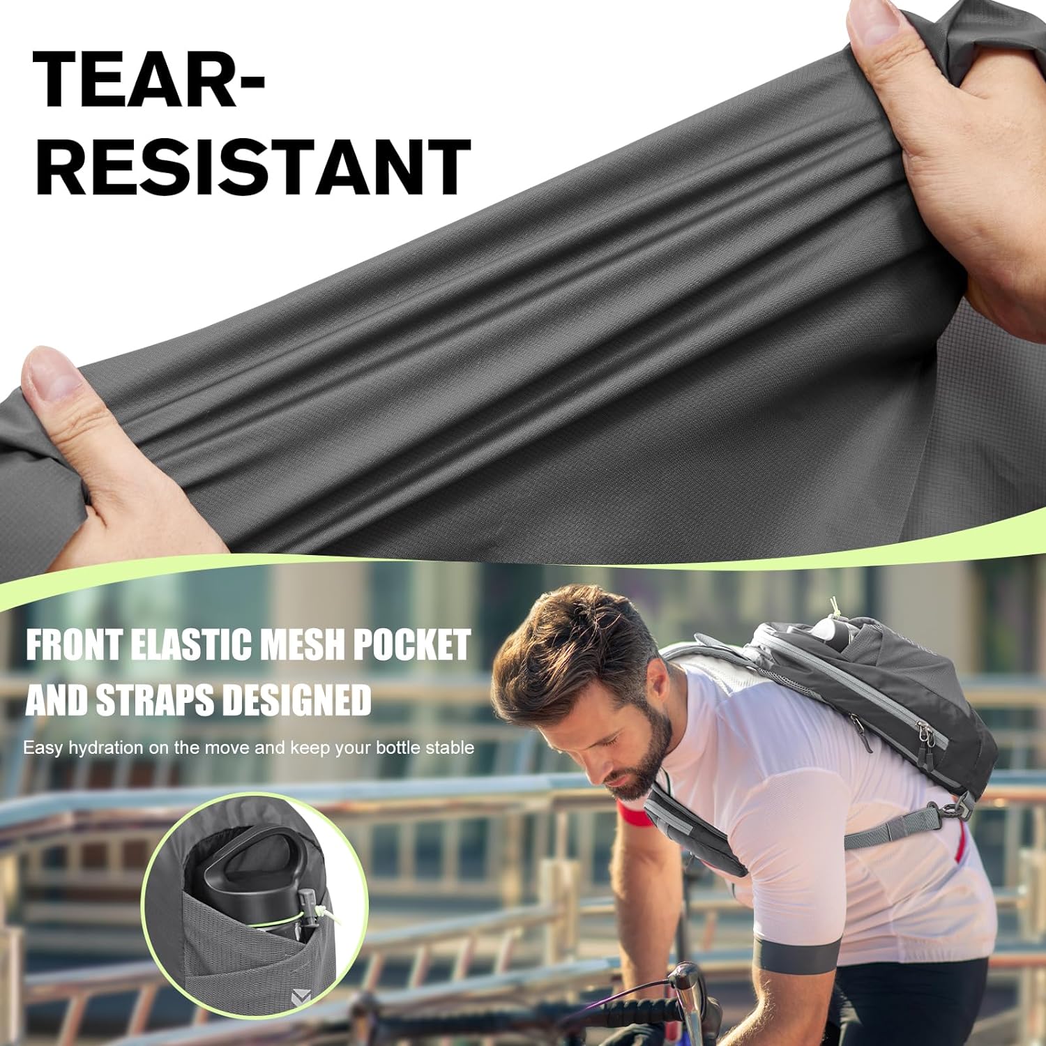 【Convenient Access to Essentials】 Engineered with a mesh front pocket and a reflective elastic strap, this design allows for swift retrieval of your water bottle while ensuring it remains securely in place. The breathable mesh material dries quickly even when if it gets wet.