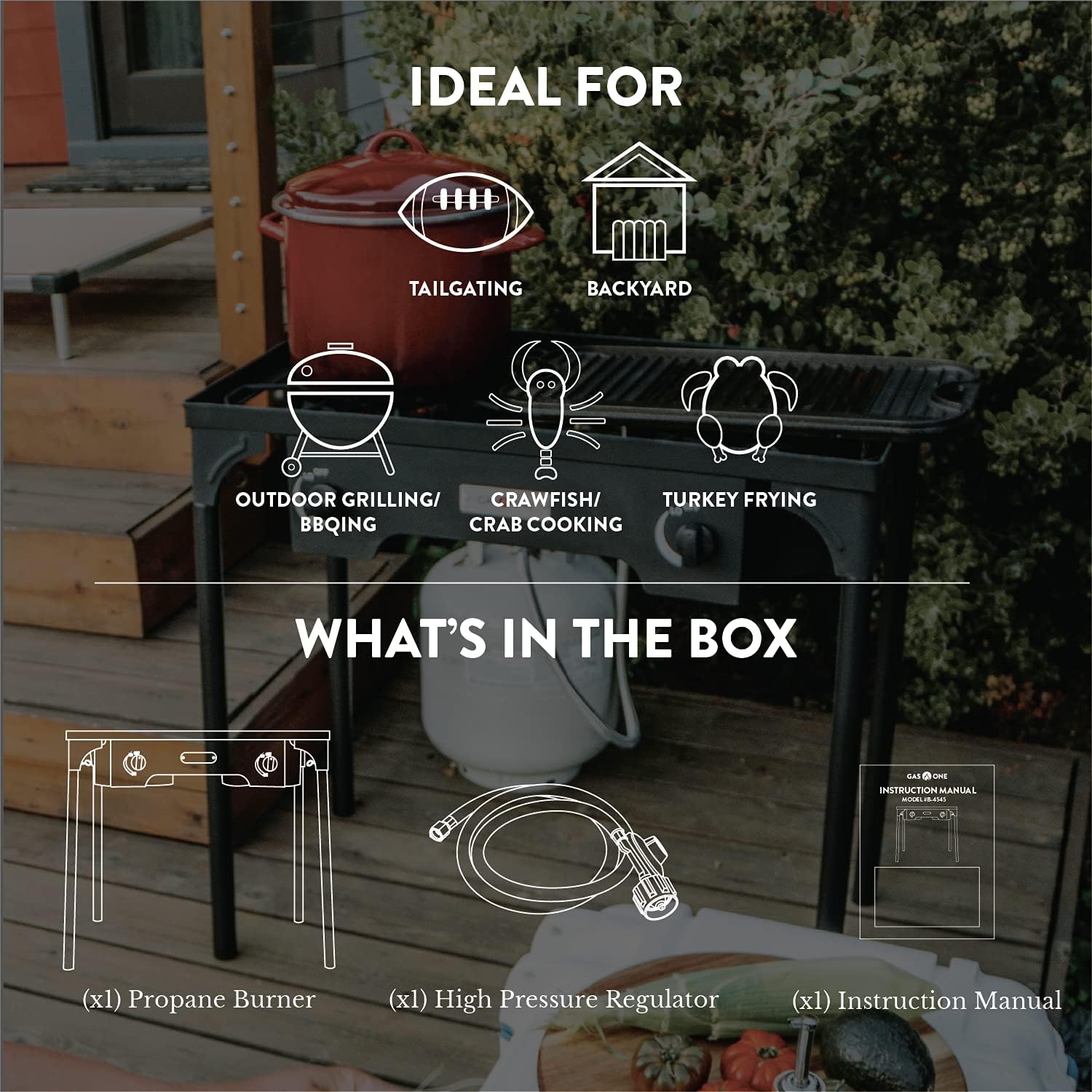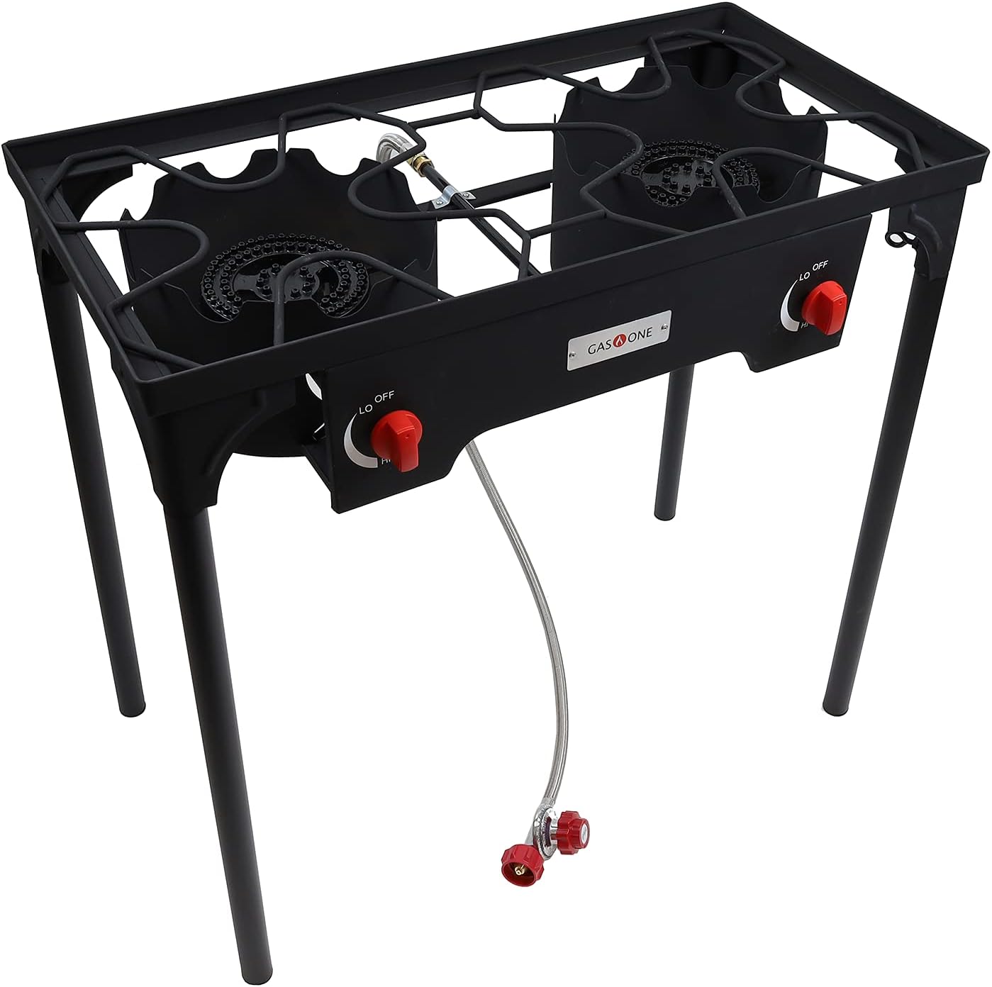 PROPANE DOUBLE BURNER FOR OUTDOOR COOKING – Equipped with two burner heads, Gas One’s Double Burner provides extreme heat for various different cooking scenarios. From tailgating to catering, this burner stands out for those looking for a little more range in their heat