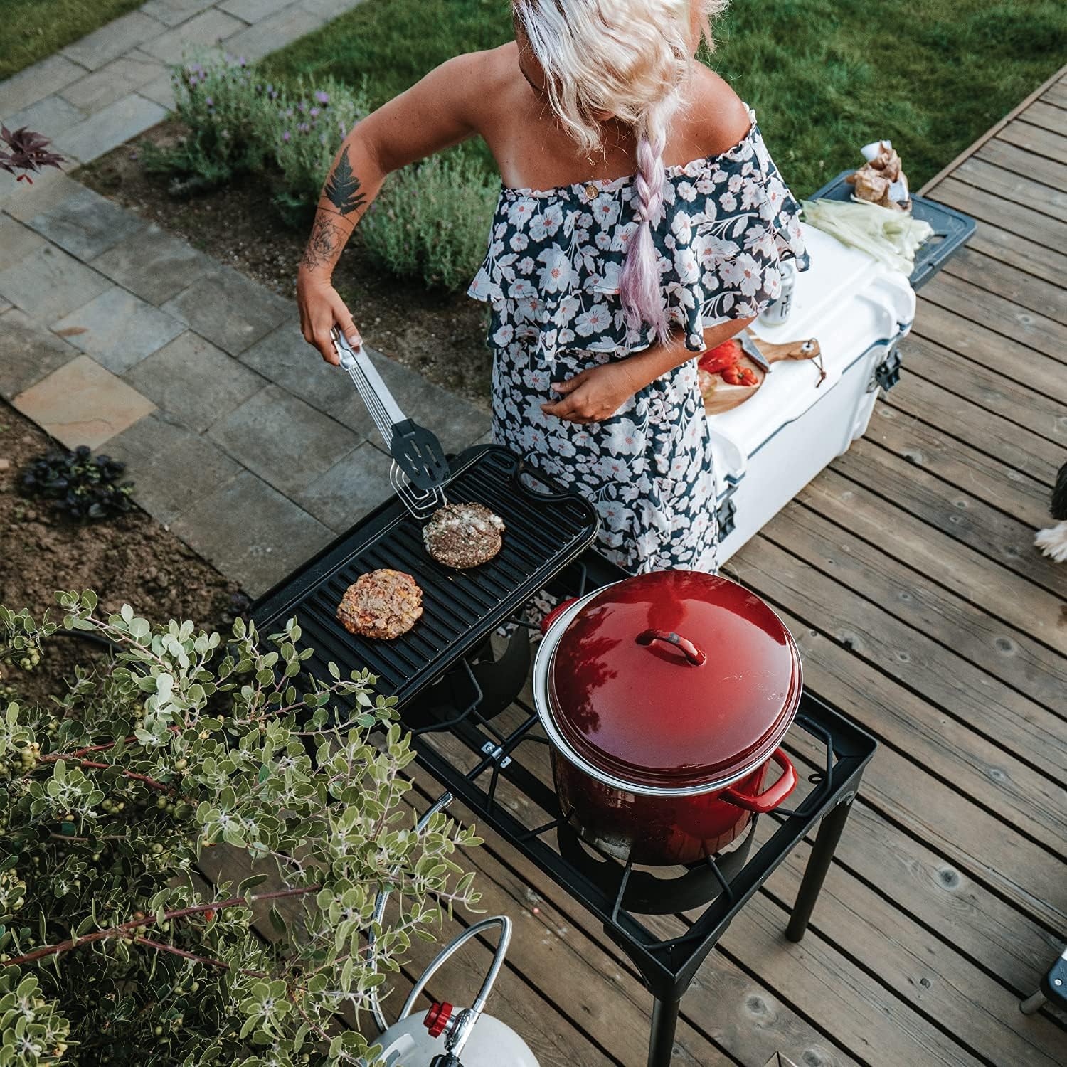 An Outdoor Staple of Outdoor Cooking As in all in one cooking system, our High-Pressure Propane Double burner is an essential staple of outdoor cooking. Constructed with two robust cast iron burners capable of emitting high heat output, it can grill, boil, steam, and fry. Built with 4 detachable legs it is easily put together and stored. Comes included is a steel-braided high-pressure regulator that allows for precise control over flame, and windscreen that provides added protection from the wind.