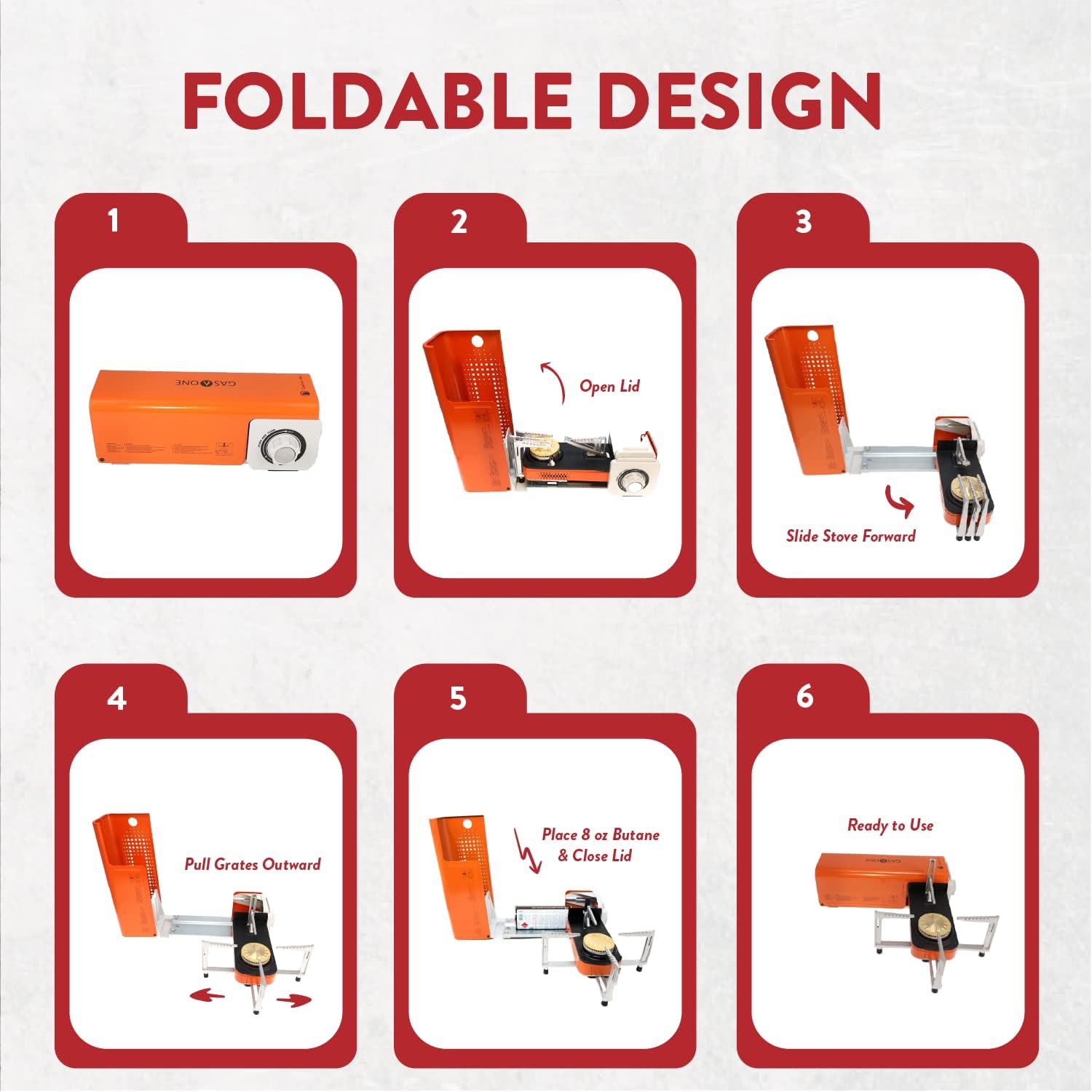 EASY SETUP – Gas One’s Spyder Stove can be easily set up (directions with pictures on the box) with minimal directions: first, open the cover and rotate the body to a 90-degree angle. Pull the middle grate outwards, extending the grates to its ready position. Insert a butane canister in the empty butane compartment and close the cover