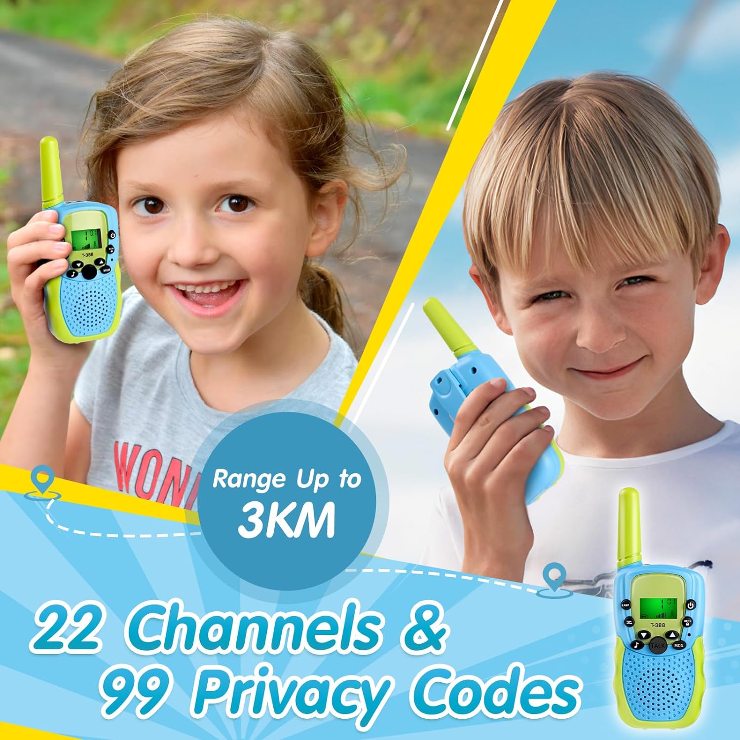 【Privacy Talk】Our kids walkie talkies 2 pack are equipped with 22 channels, reinforced by 99 CTCSS subcodes. Only can communicate on the same channel and same subcode. So that you can minimize the likelihood of other people being able to communicate with your children by using the same frequency. Range up to 3KM in outdoor open ground without shelter, up to 1.5KM in neighborhood conditions. Funny toys for 3 4 5 year old boys and girls!