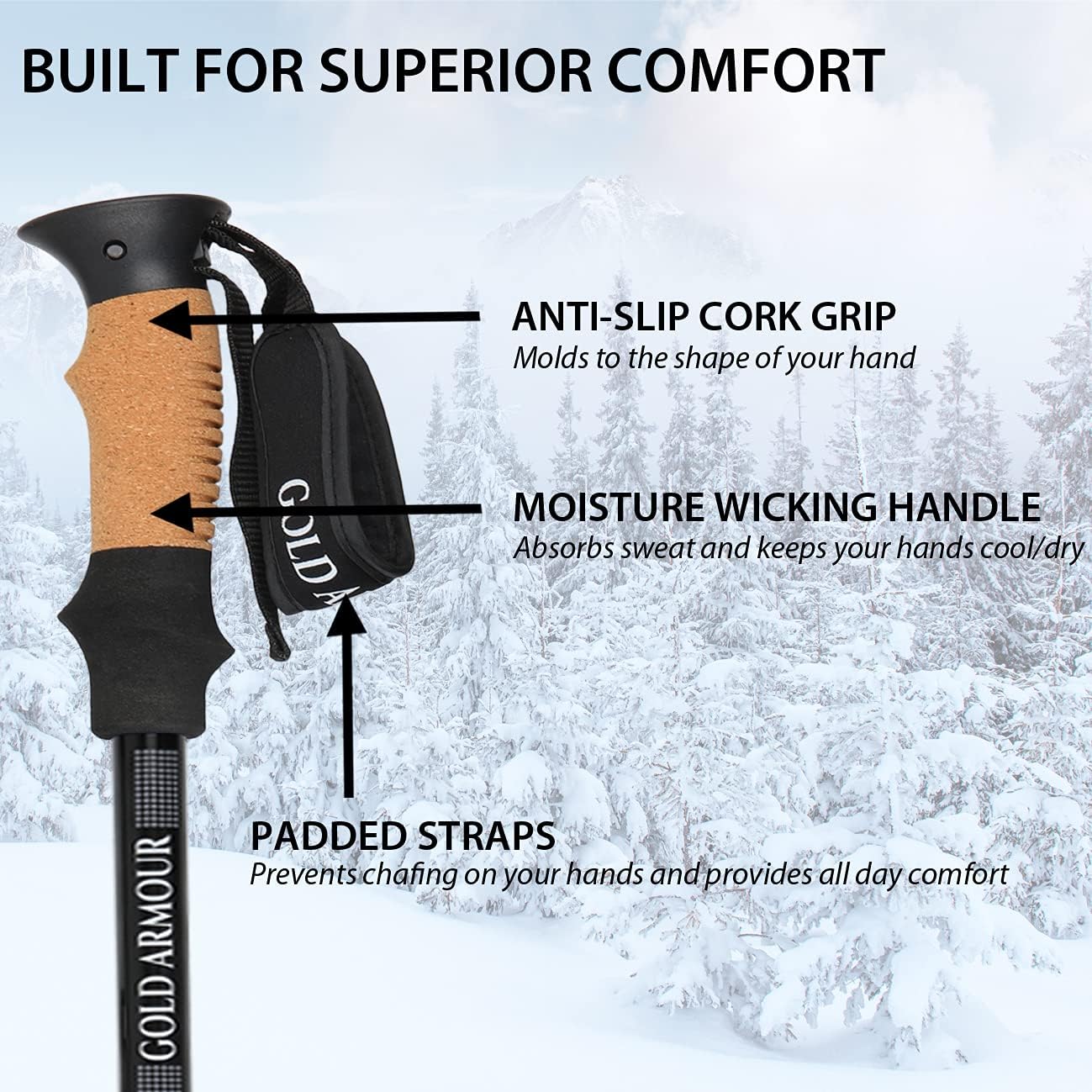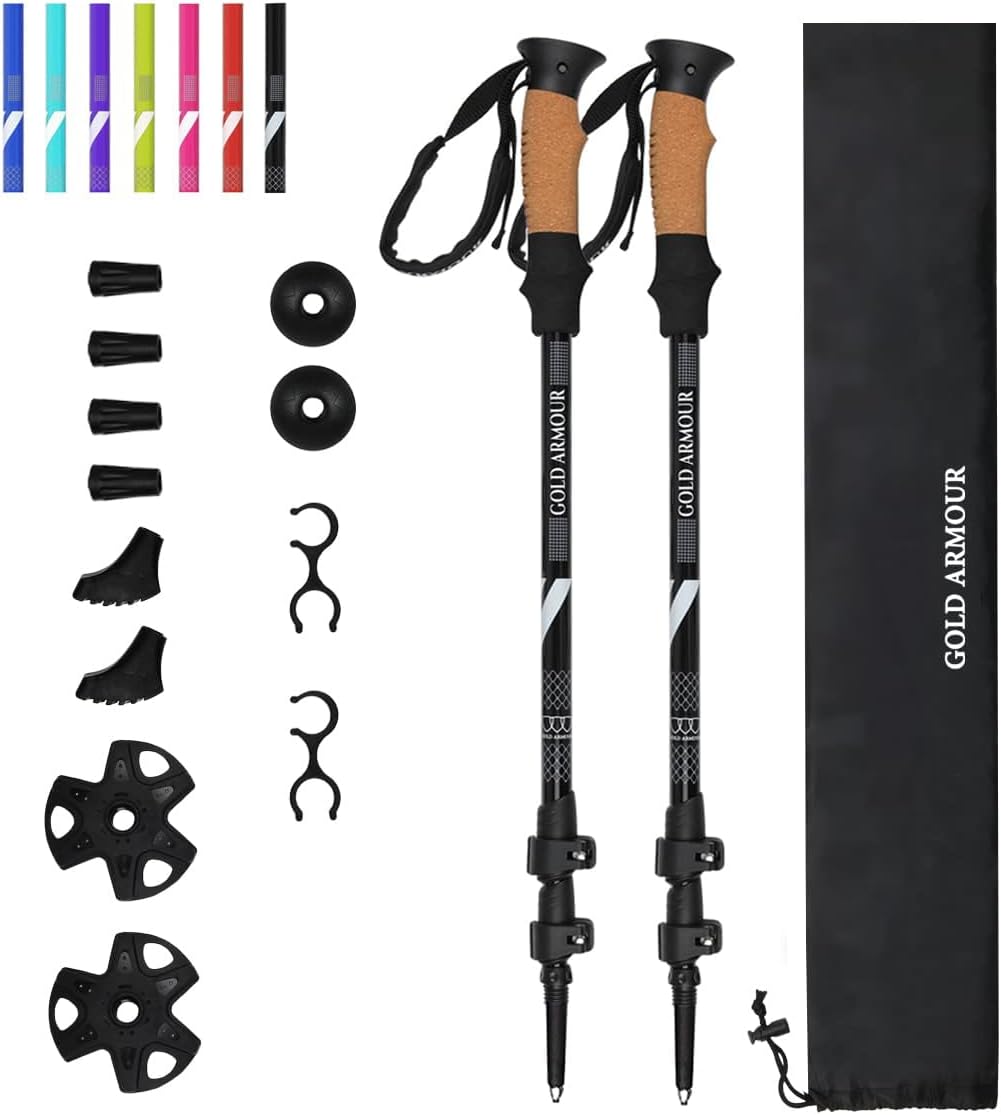ALL TERRAINS: From climbing icy mountains to easy urban walk, our Gold Armour Trekking Poles includes heavy duty 4 season accessories and a tungsten carbide tip won’t let you down. 4 Rubber tips, 2 Snow baskets, 2 Mud baskets 2 Asphalt & Rocks tips, and 1 carrying case are included