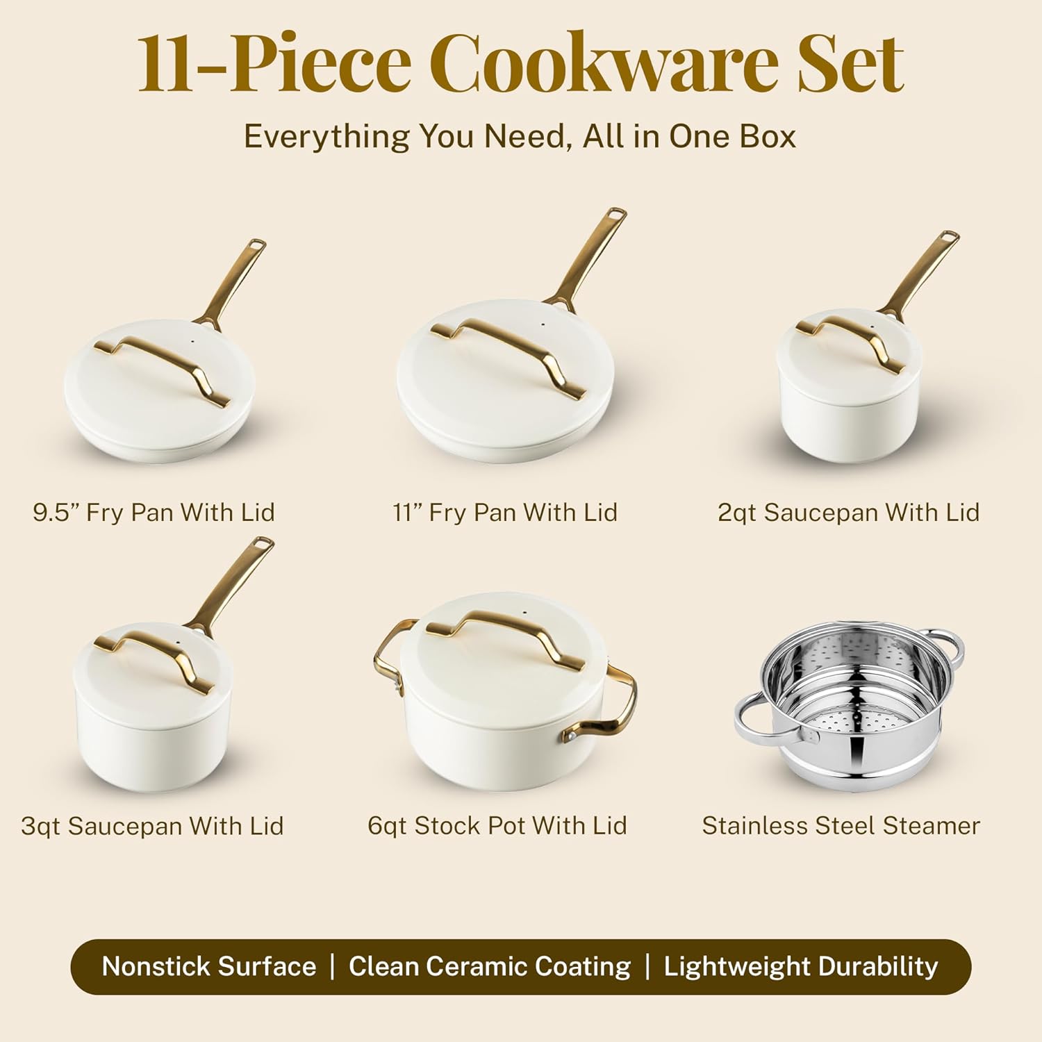 11-PIECE COOKING SET: Every piece you need to update your kitchen in a style that matches, including a 9.5” fry pan with lid, 11” fry pan with lid, 2qt saucepan with lid, 3qt saucepan with lid, 6qt stock pot with lid, and stainless steel steamer.