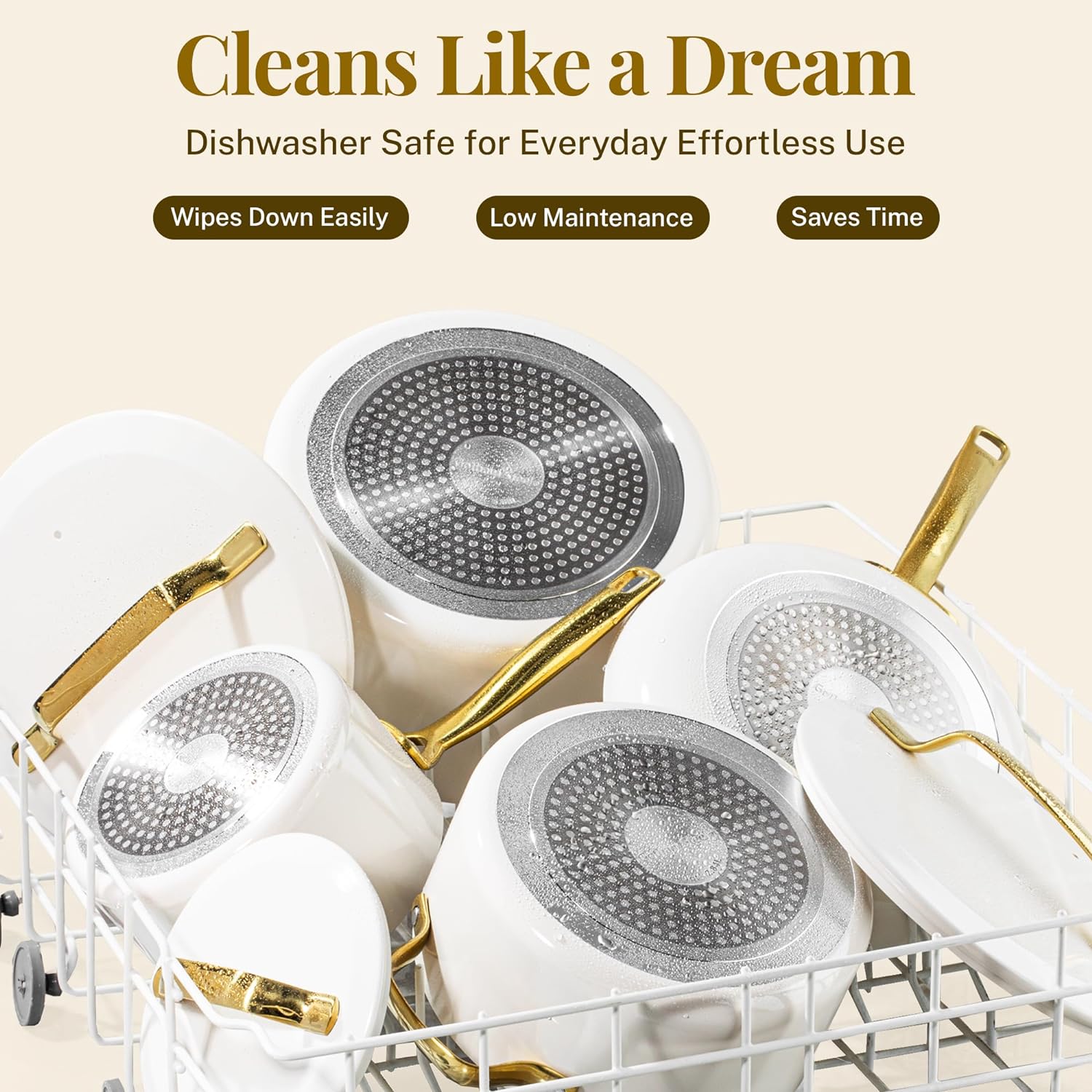 DISHWASHER SAFE POTS AND PANS SET: Cleaning up after your meal is effortless. Add your cookware to your dishwasher and let it do the hard work.