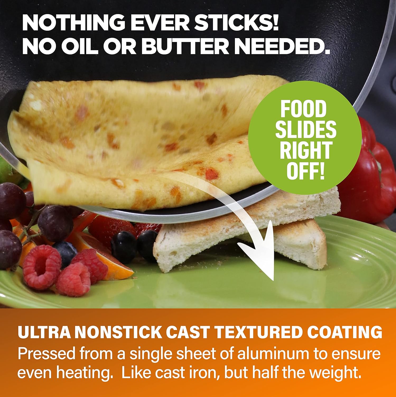 ULTRA NONSTICK – the nonstick cooking surface is coated three times and reinforced with diamonds to deliver the ultimate food release. No oil or butter needed makes for healthier eating, and provides for hassle free, 1-2-3 cleanup