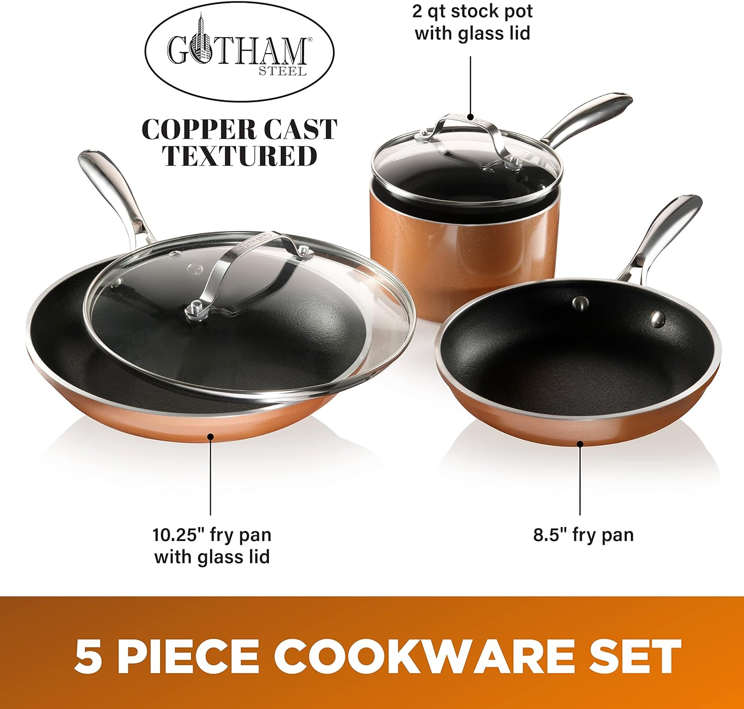 NONSTICK COOKWARE SET – this starter cookware set includes everything you need to outfit your kitchen and get cooking right out of the box, including an 8.5″ round frying pan, 10.25″ round frying pan, glass lid for 10.25 frying pan, 2 quart saucepan with tempered glass lid, ULTRA NONSTICK – the nonstick cooking surface is coated three times and reinforced with diamonds to deliver the ultimate food release. No oil or butter needed makes for healthier eating, and provides for hassle free, 1-2-3 cleanup, HEALTHY & 100% NON-TOXIC – the Gotham Steel coating is derived from minerals and reinforced with diamonds, making this frying pan free of PFOA, PFOS, lead & cadmium for an eco-friendly, healthy experience, METAL UTENSIL SAFE – the coating of the pan is infused with diamonds, the strongest material on earth which makes it durable enough to withstand metal utensils, spatulas, spoons, whisks and even electric beaters while delivering years of outstanding, nonstick use, EFFORTLESS CLEANUP, DISHWASHER SAFE– spend less time with cleanup! After all the cooking and prepping is done, place cookware in the dishwasher for quick and easy cleanup, STOVETOP & OVEN SAFE – compatible with all stovetops (gas, electric, glass) besides induction & oven safe up to 500° F , STAY COOL HANDLES – the stainless-steel handles are ergonomically designed for both righty and lefties & the unique Y shaped handles let’s heat escape and keeps the handles cool to the touch, EVEN HEAT DISTRIBUTION – aluminum composition ensures even heat distribution all around with no dead zones or hot spots.