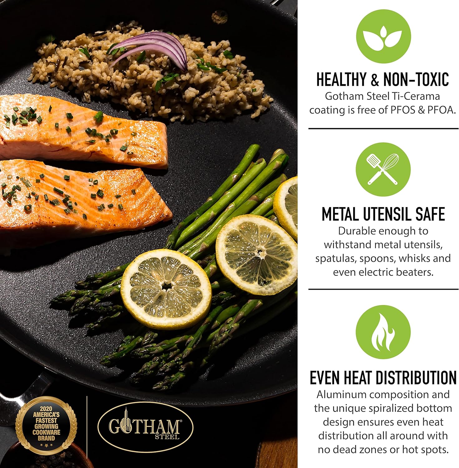 HEALTHY & 100% NON-TOXIC – the Gotham Steel coating is derived from minerals and reinforced with diamonds, making this frying pan free of PFOA, PFOS, lead & cadmium for an eco-friendly, healthy experience