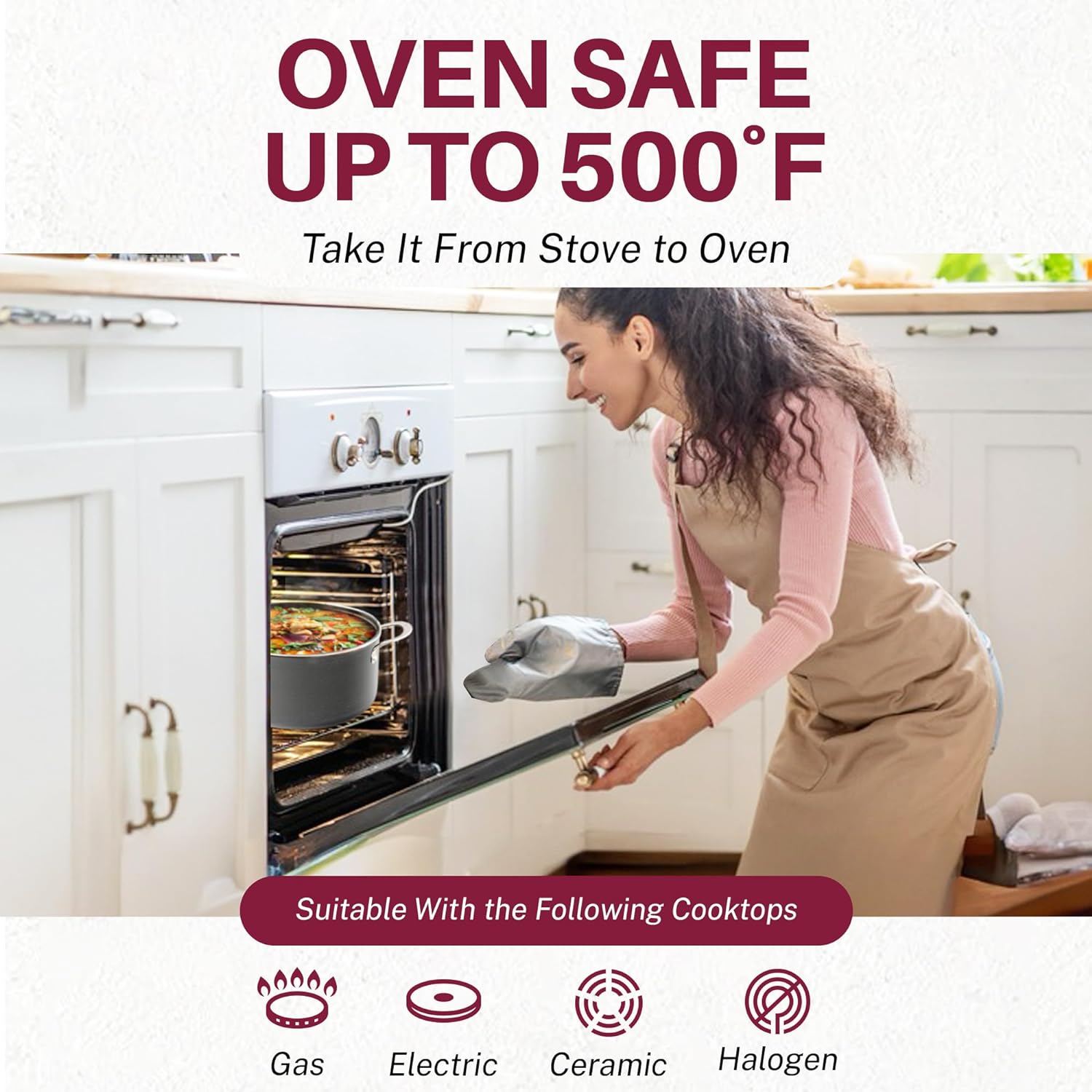 COOKTOP & OVEN SAFE – Compatible with gas, electric, glass cooktops & oven safe up to a sizzling up to 500° Fahrenheit, lids included! Please note, this set isn’t compatible with induction cooktops