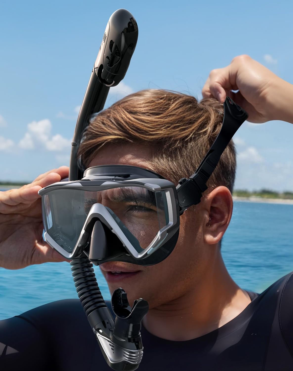 ADJUSTABLE HEAD STRAP & FITS FOR MOST: The snorkeling mask fits different face shapes, suitable for adults and kids. Durable adjustable silicone head strap has secure ratcheting buckles; mask strap clip features a quick-release design to allow the snorkel and diving mask to be separated quickly.