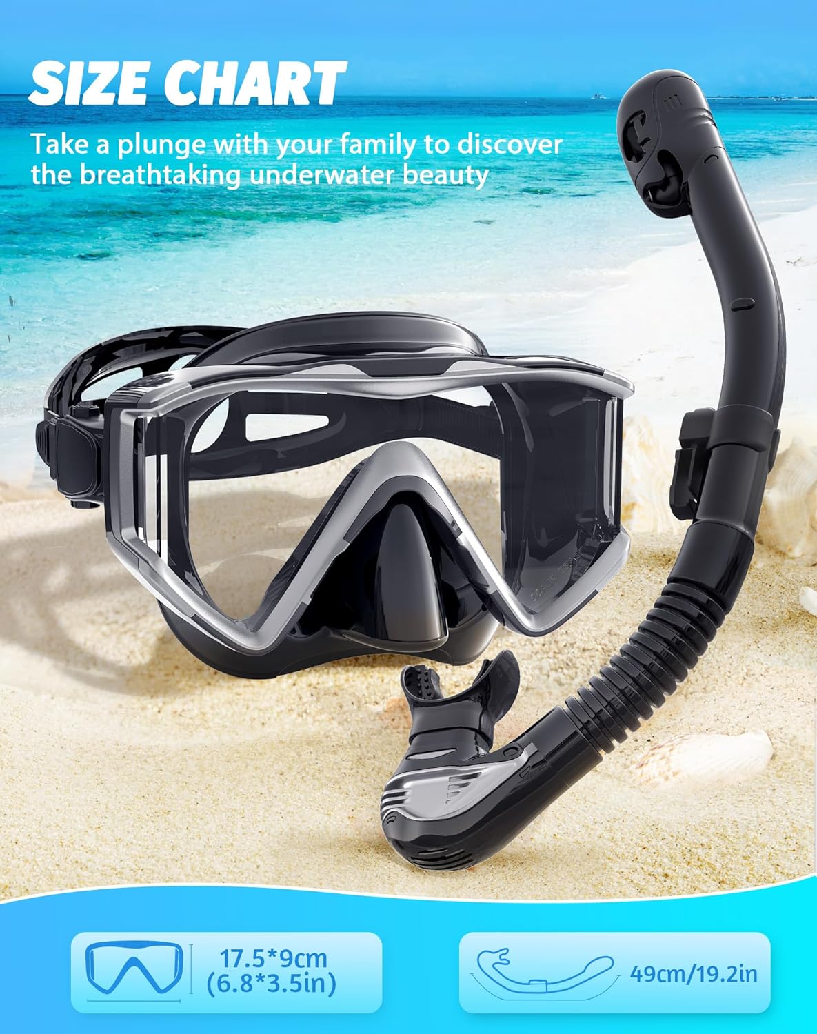 DRY TOP SNORKEL & EASY TO BREATH: Our dry snorkel adopting the most stable dry floate valve design at the top of breathing tube. When immersed in water, the snorkel is sealed to prevent water from entering the breathing tube, the lower purge valve can quickly drain the water. When the snorkel is above water, the valve opens to let air in and you can breath easily.