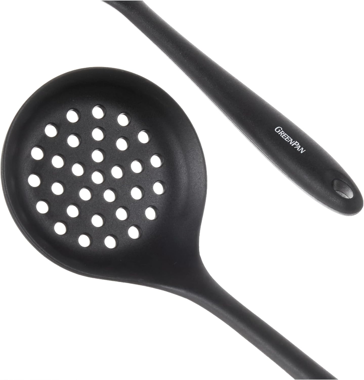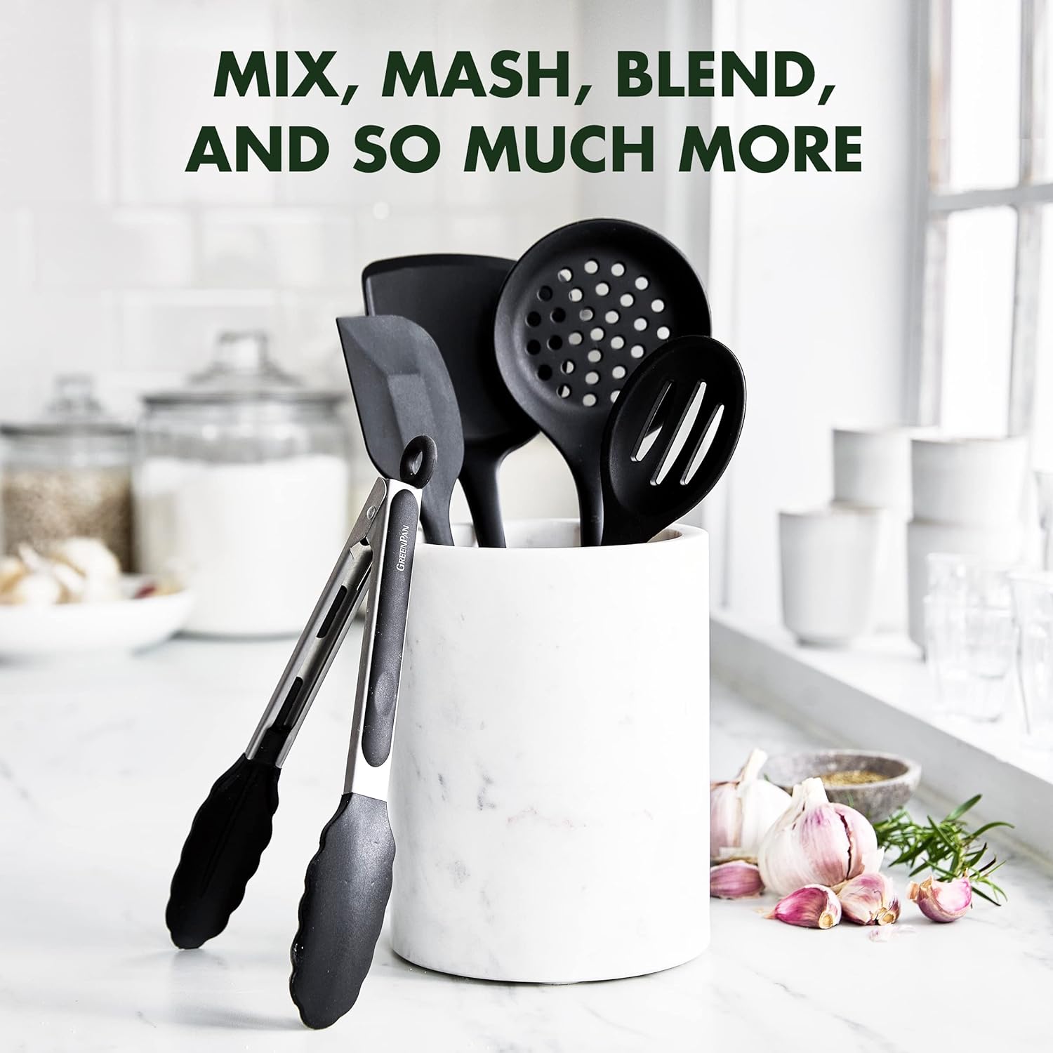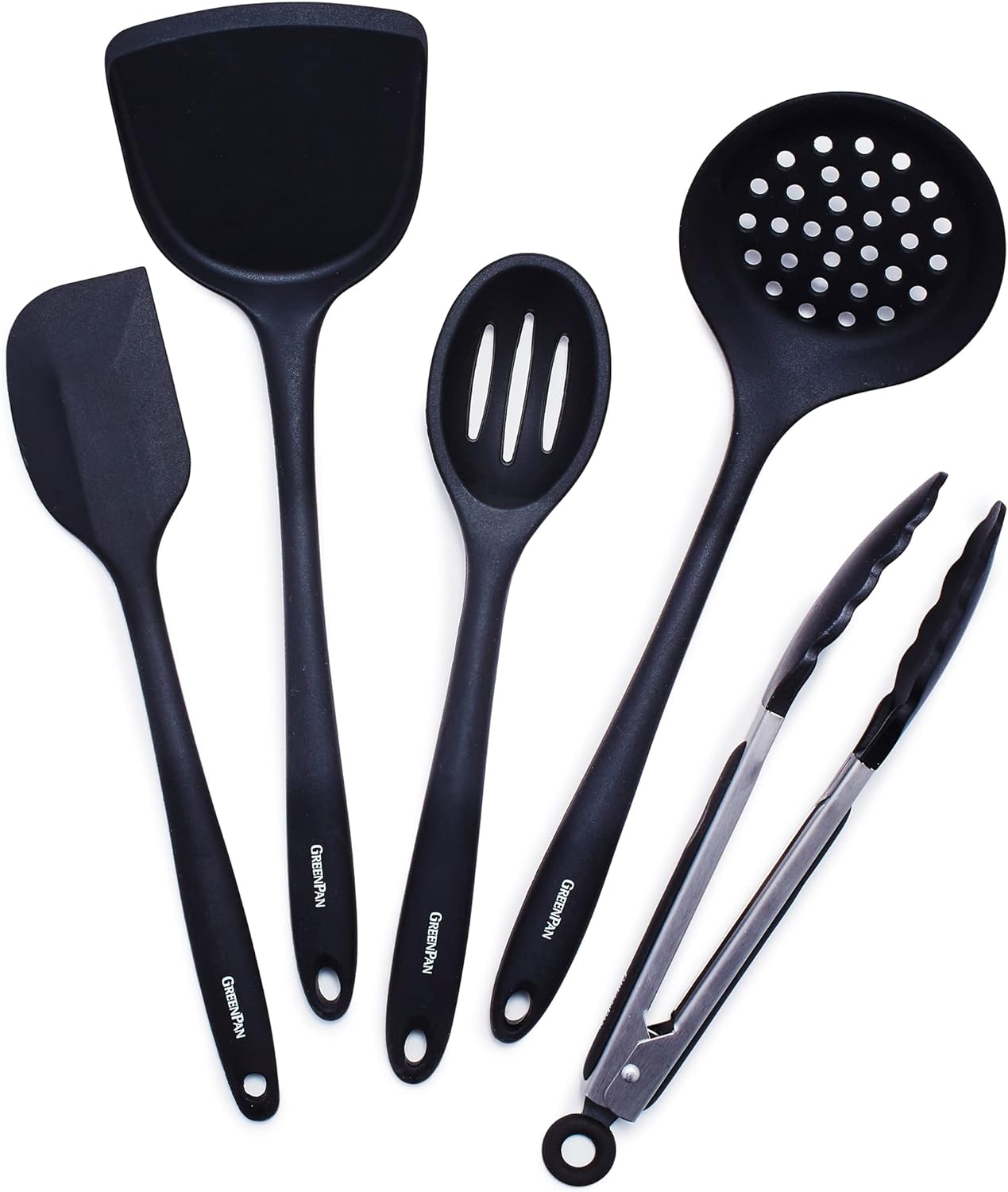 GreenPan 5 Piece Cooking Utensil Set, Flexible Nonstick Silicone, Stain-Free, Tongs, Turner, Spatula, Skimmer, and Slotted Spoon, Black