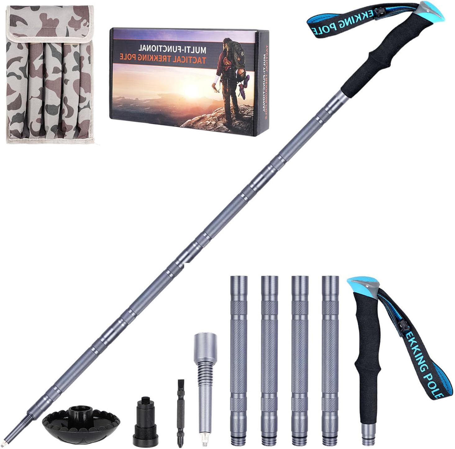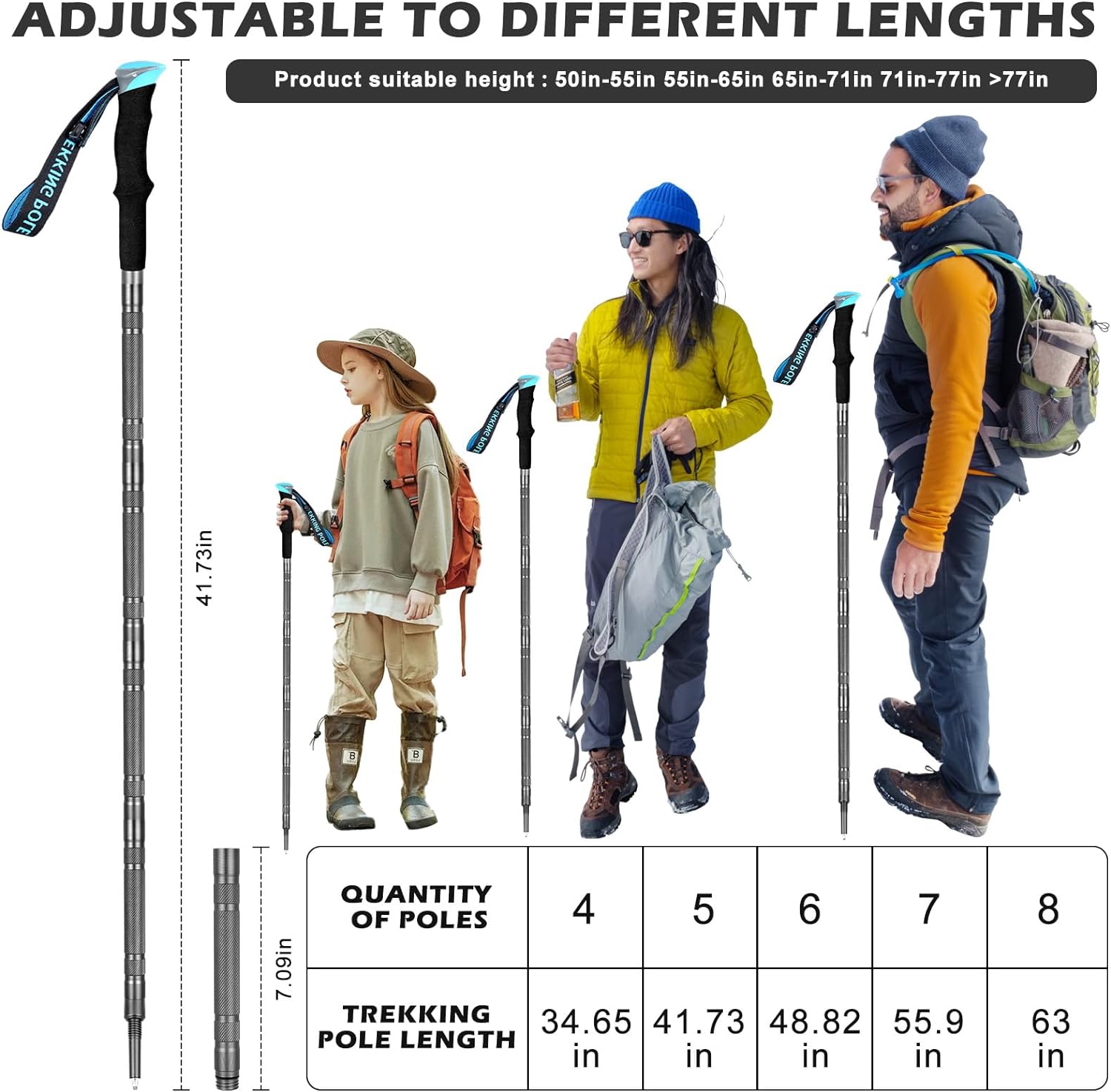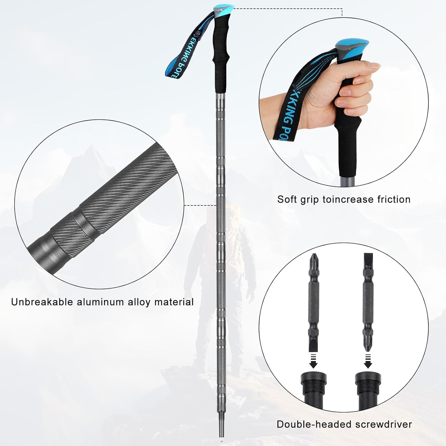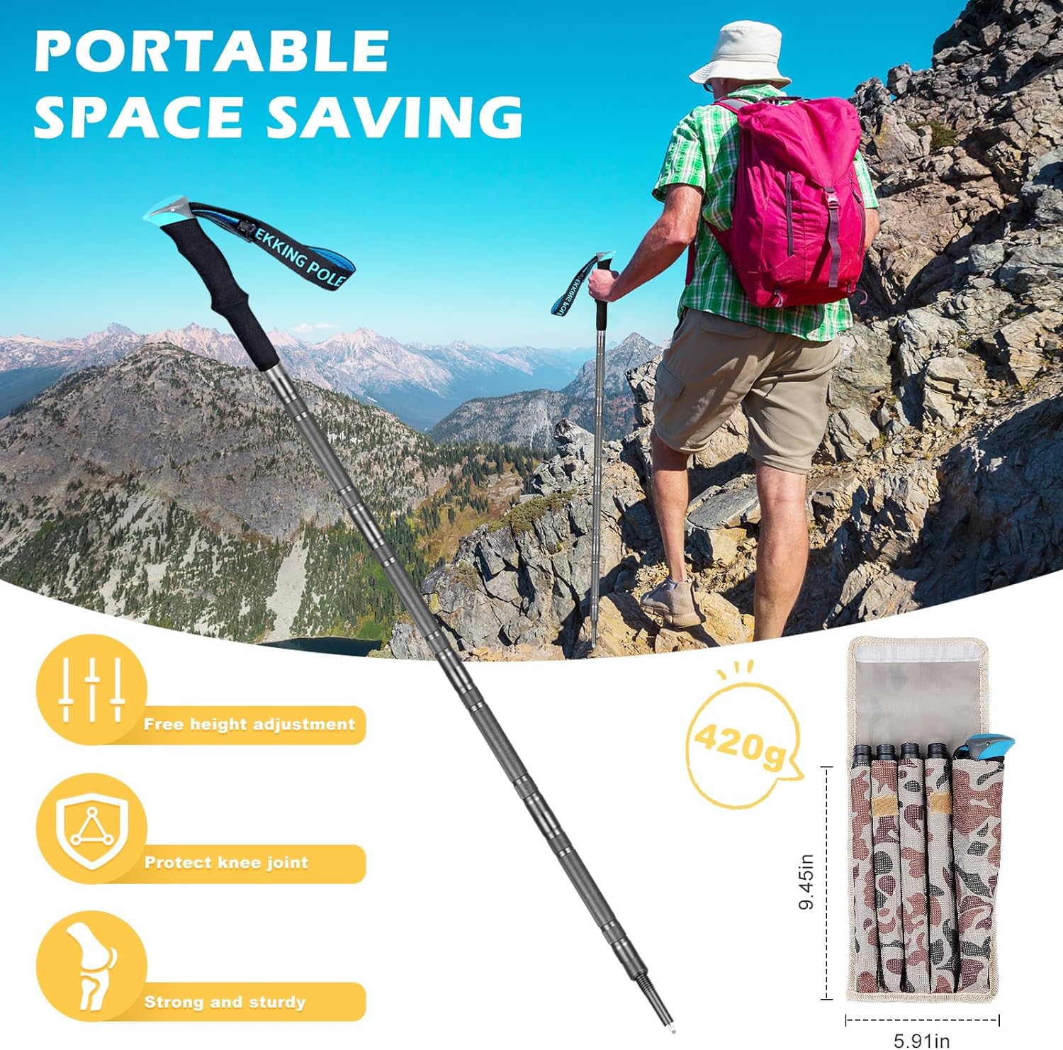 Portable: This trekking poles for hiking disassembles into 5 7″ poles and can be hung with its own storage bag (9.45″*5.9″) or stored in your hiking bag without taking up space, ensuring that no matter where you roam , it’s always within reach.