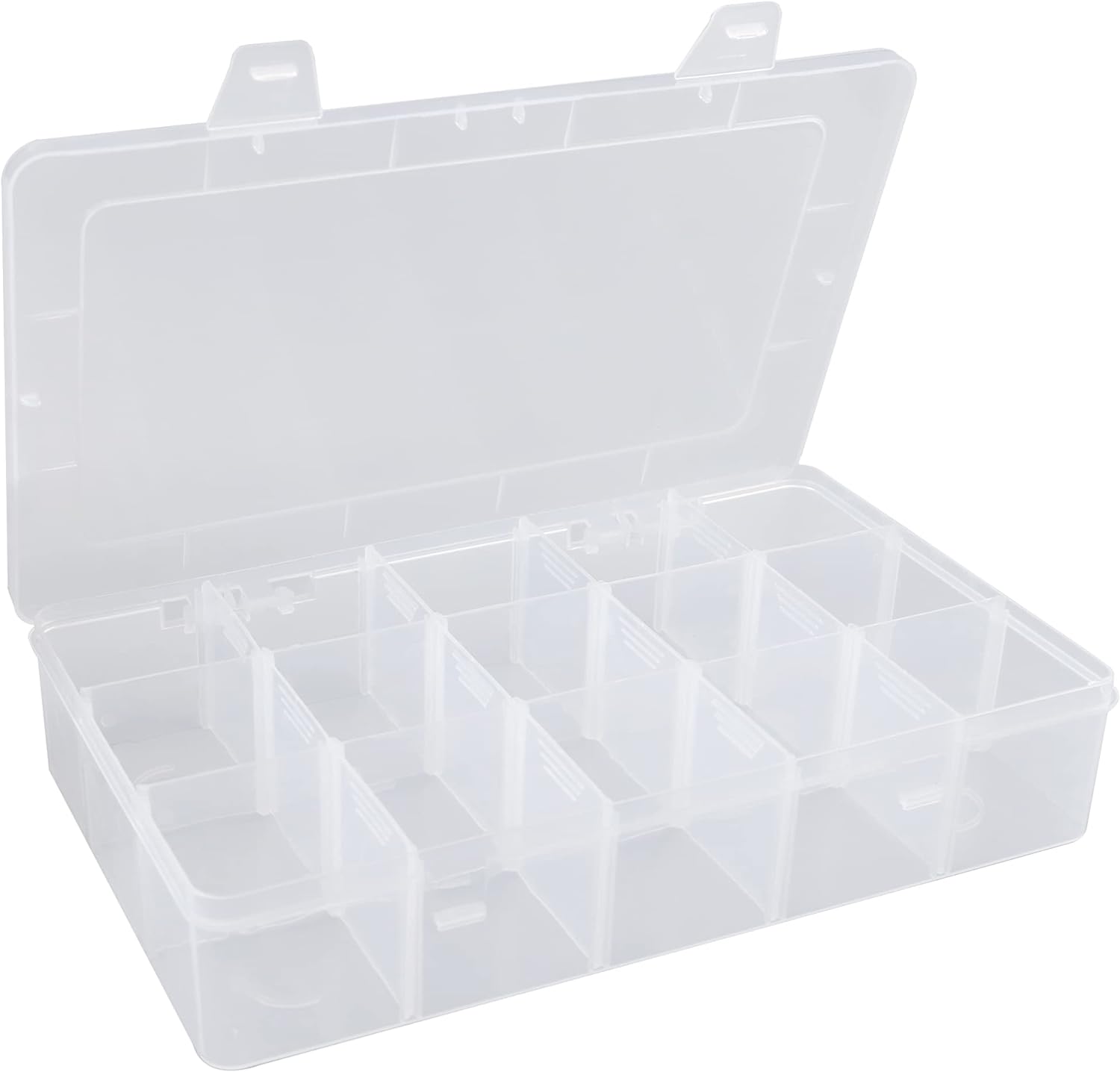 Clear Tackle Box Organizer: Container with dividers allows you to customize storage of your tackles and tools. Clear enough to see from without opening, making it easily to find out your wanted items. Good latch system and undetachable hinged lid snaps tight, no scattering.