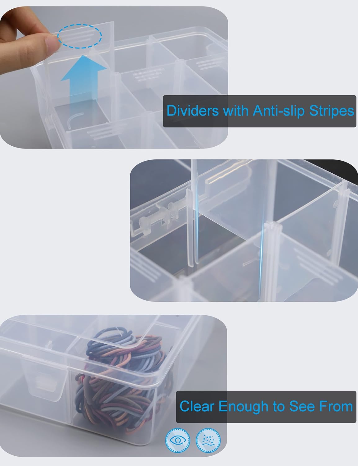 Plastic Organizer Box with Dividers: Dividers with anti-slip stripes, easy yo pick up. Plastic Organizer Box with dividers keeps small items in proper sections, don’t spill over into other compartments, keeps your stuff safe.
