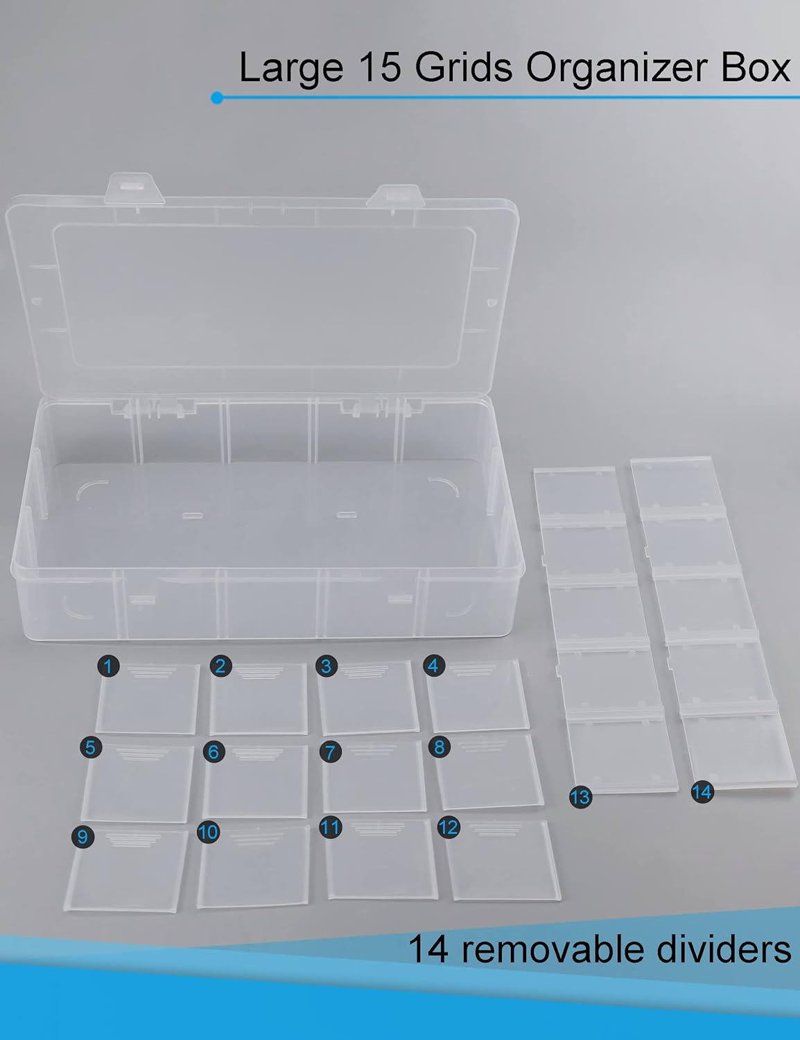 Large 15 Grids Organizer Box: 14 removable dividers make plastic organizer box has 15 same compartments (each square is 2*2*2in). Each divider can remove for entire open storage (10.8*6.3*2.2inch).