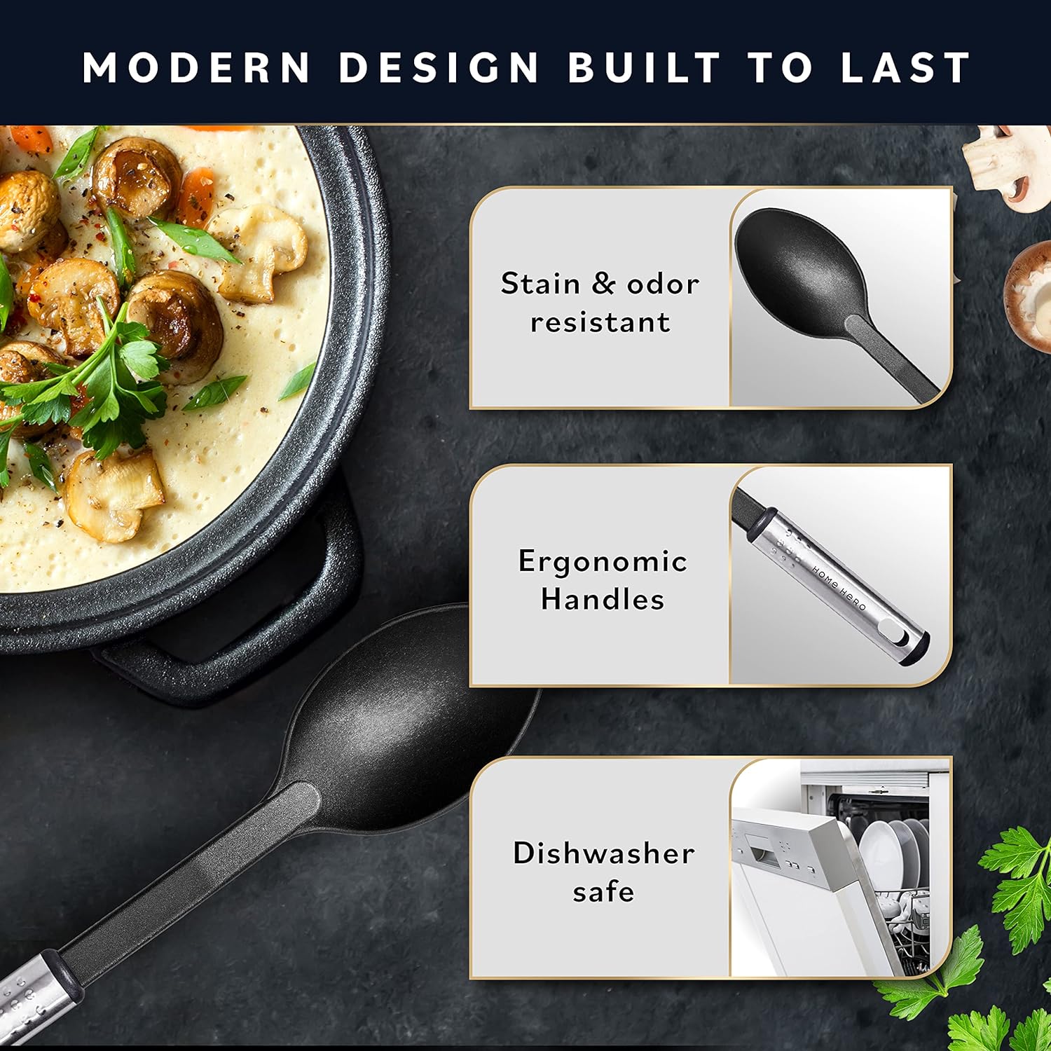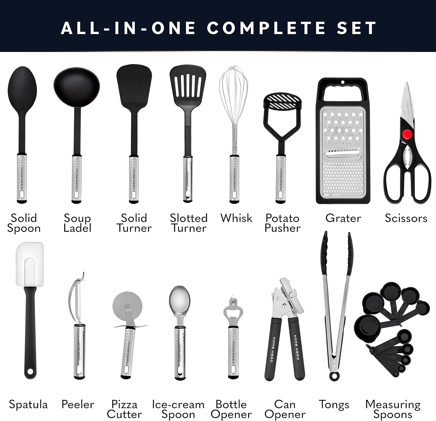 Worth the Investment – This all-in-one high quality black utensil set includes 1 solid spoon, 1 soup ladle, 1 solid turner, 1 slotted turner, 1 whisk, 1 potato pusher, 1 grater, 1 scissors, 1 spatula, 1 peeler, 1 pizza cutter, 1 ice-cream spoon, 1 bottle opener, 1 can opener, 1 set of tongs, 5 measuring cups and 5 measuring spoons.