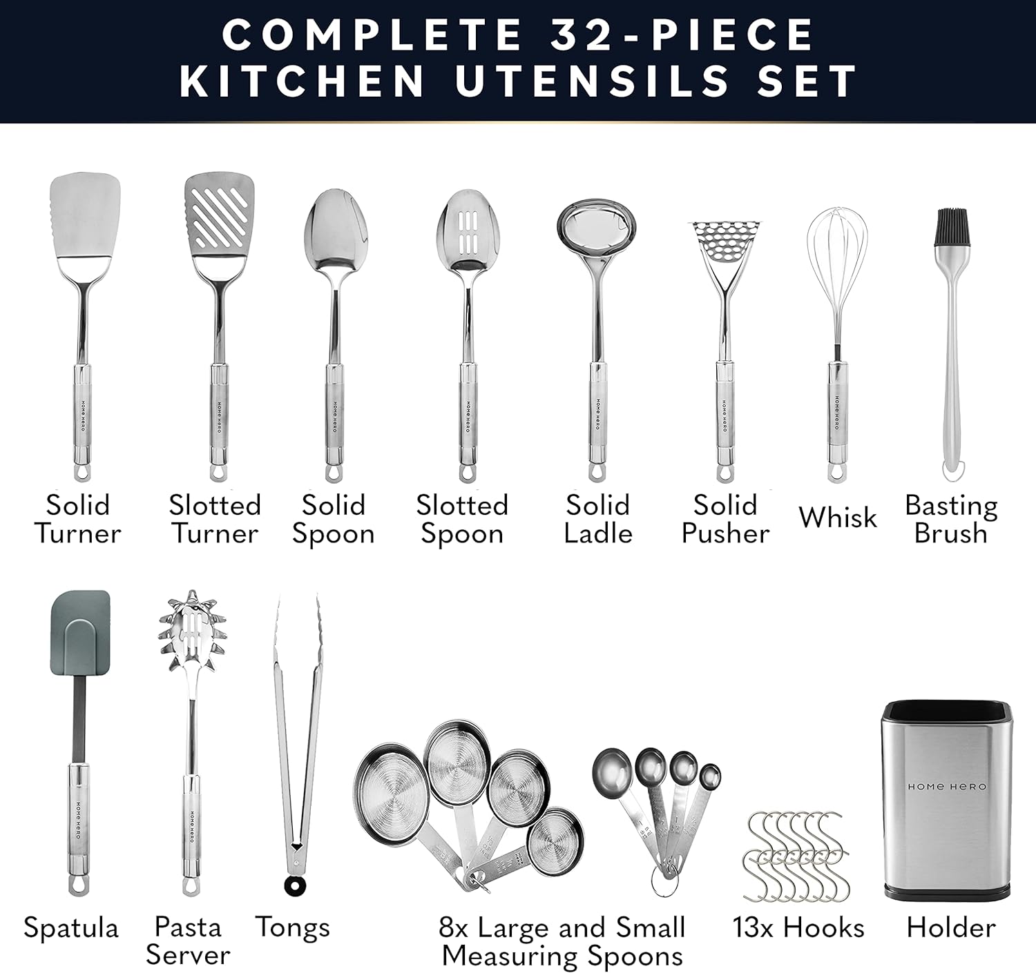 Suited to any kitchen, HomeHero is the best kitchen utensils set you could ask for. Crafted with 100% stainless steel & silicone non – stick materials, these timeless stainless steel utensil set are beautiful housewarming gifts. With measuring cups & measuring spoons, skimmer, slotted spatula, garlic press, cheese knife, tea strainer, wine opener, potato peeler & more, you have everything you need to cook masterful meals. Scroll to see complete list of cooking tools.