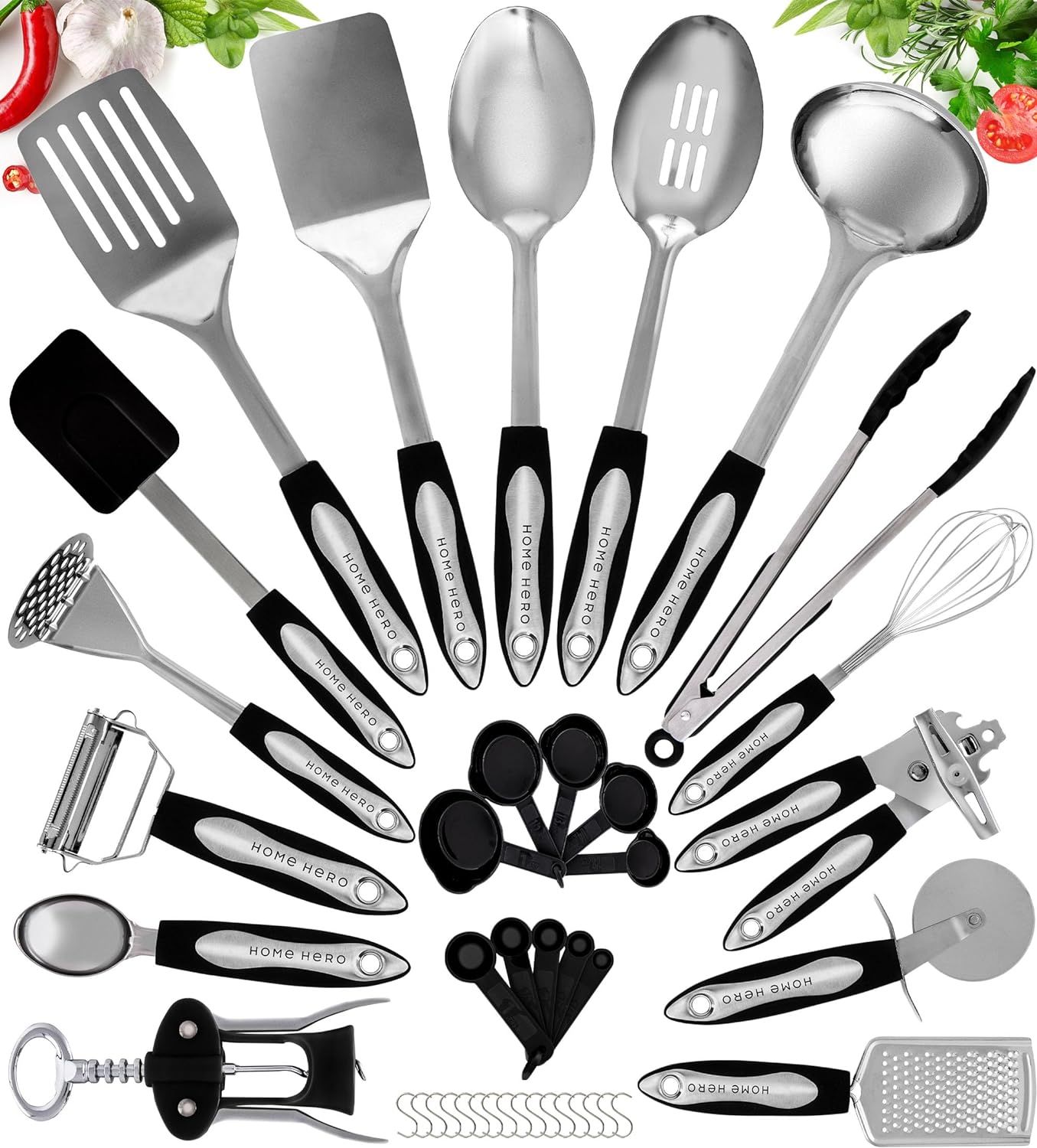 Suited to any kitchen, HomeHero is the best kitchen utensils set you could ask for. Crafted with 100% stainless steel & silicone non – stick materials, these timeless stainless steel utensil set are beautiful housewarming gifts. With measuring cups & measuring spoons, skimmer, slotted spatula, garlic press, cheese knife, tea strainer, wine opener, potato peeler & more, you have everything you need to cook masterful meals. Scroll to see complete list of cooking tools.