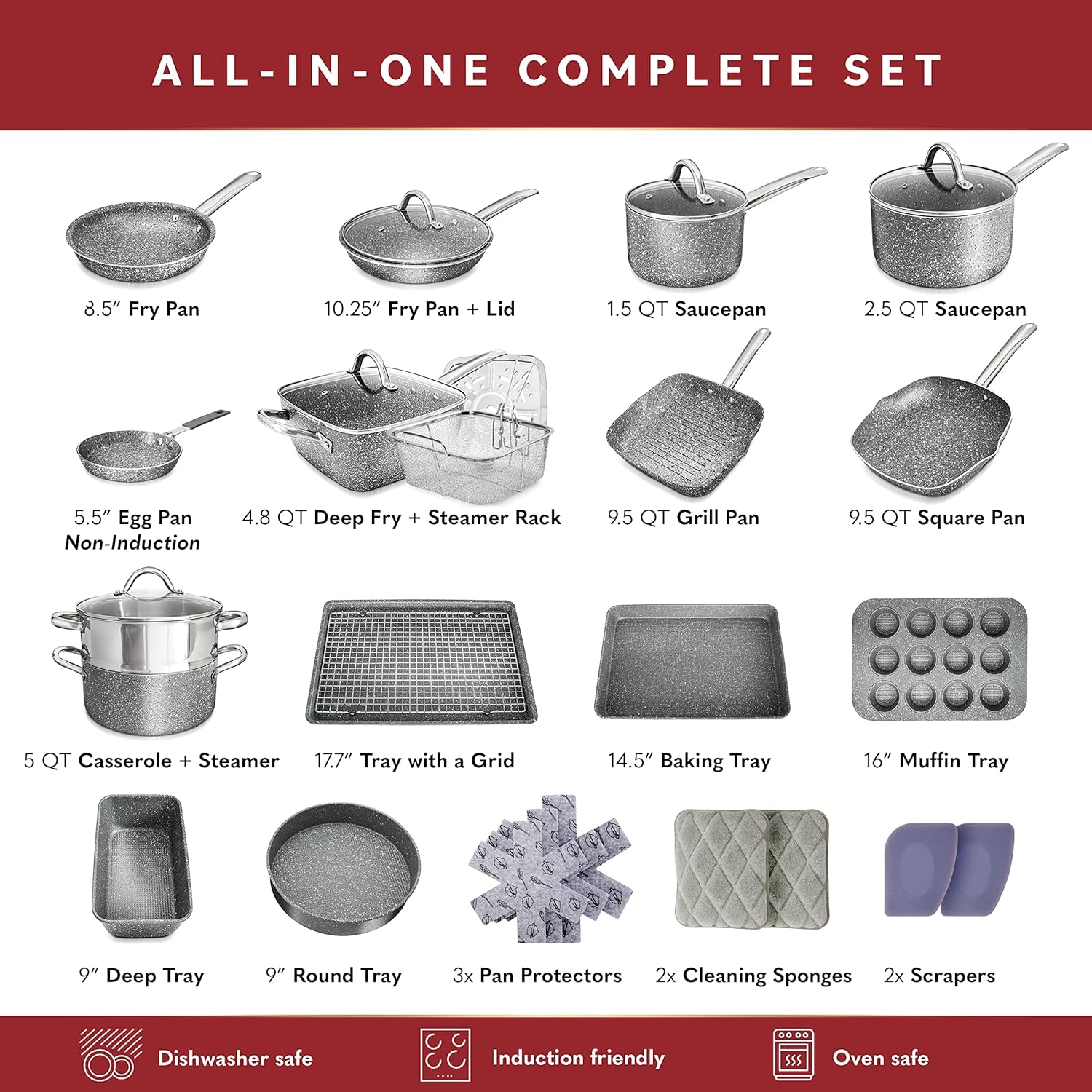 The Perfect Pots and Pans Set for Any Cooking Enthusiast – This 23-piece granite pots and pans set is everything you need to get cooking in your kitchen. Not just that, it also makes an appreciable housewarming gift or holiday gift for your loved ones. Along with its extensive set of pots and pans, this nonstick cookware set also includes 3 pan protectors, 2 cleaning sponges and 2 pan scrapers.