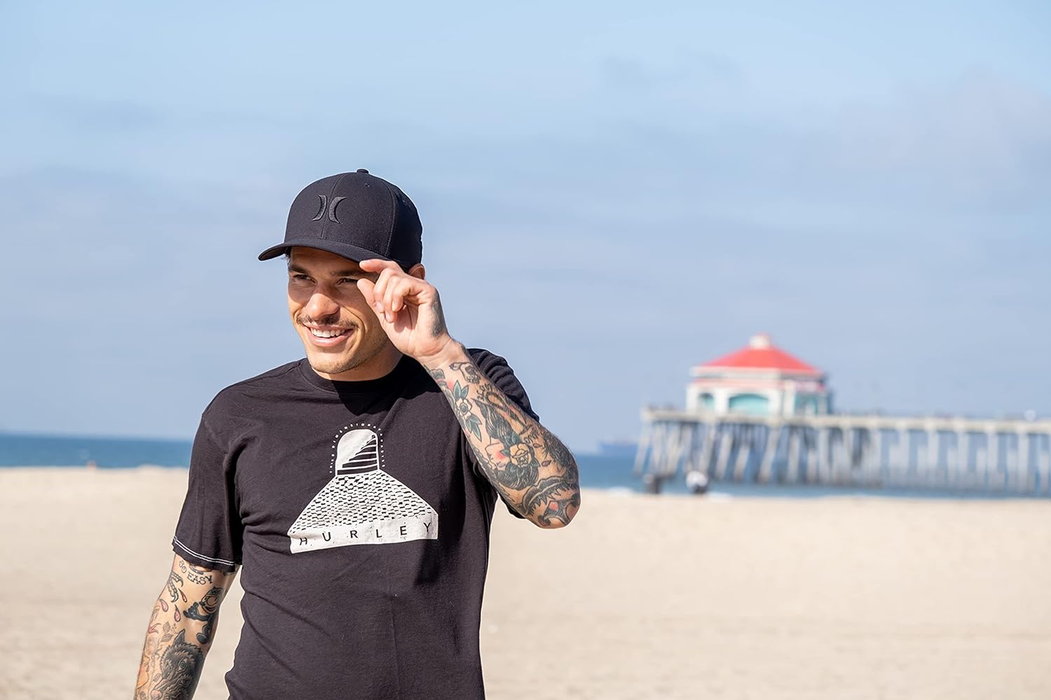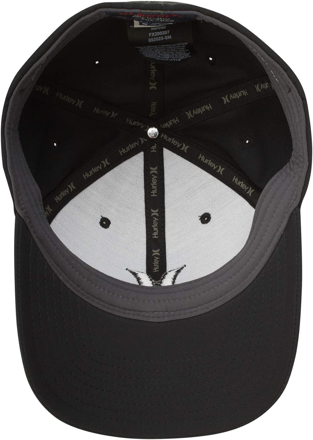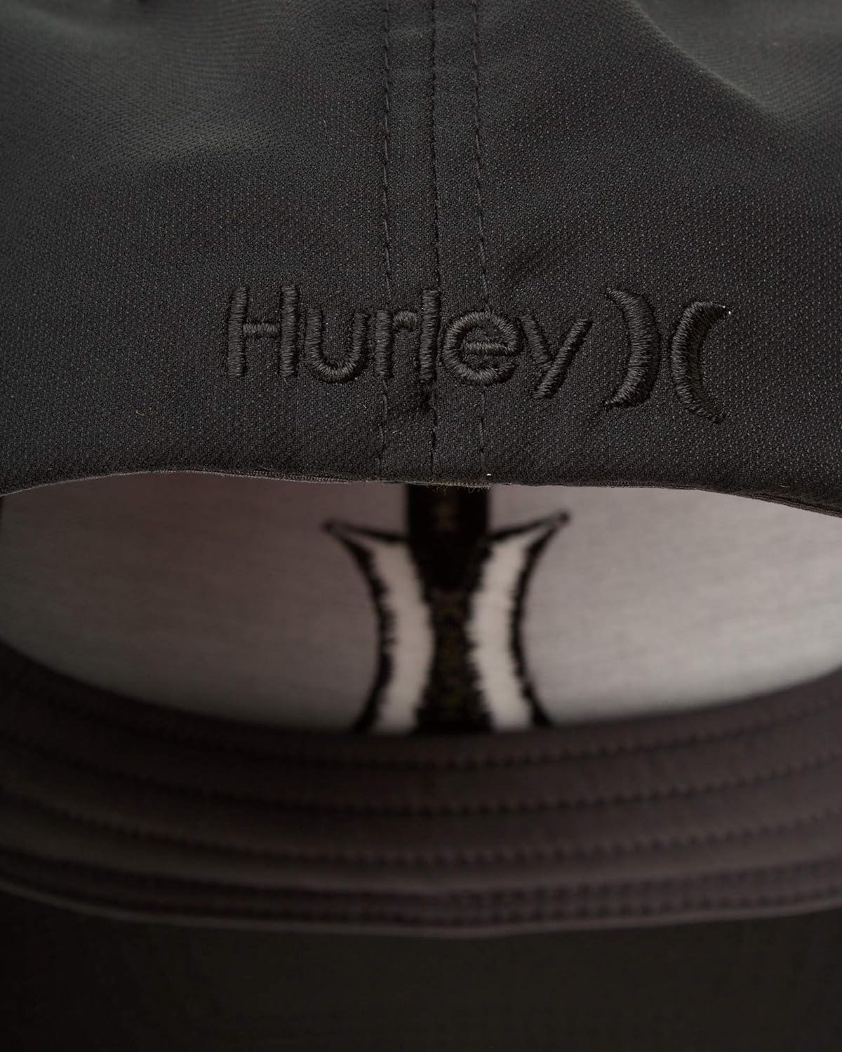 Hurley logo embroidered on front and back of baseball cap.