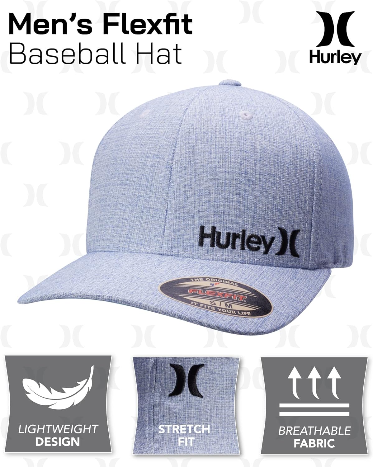 The Hurley Corp Men’s Fitted Hat is made with a Flexfit band and embroidered front and back icon logos for snug comfort and a signature look