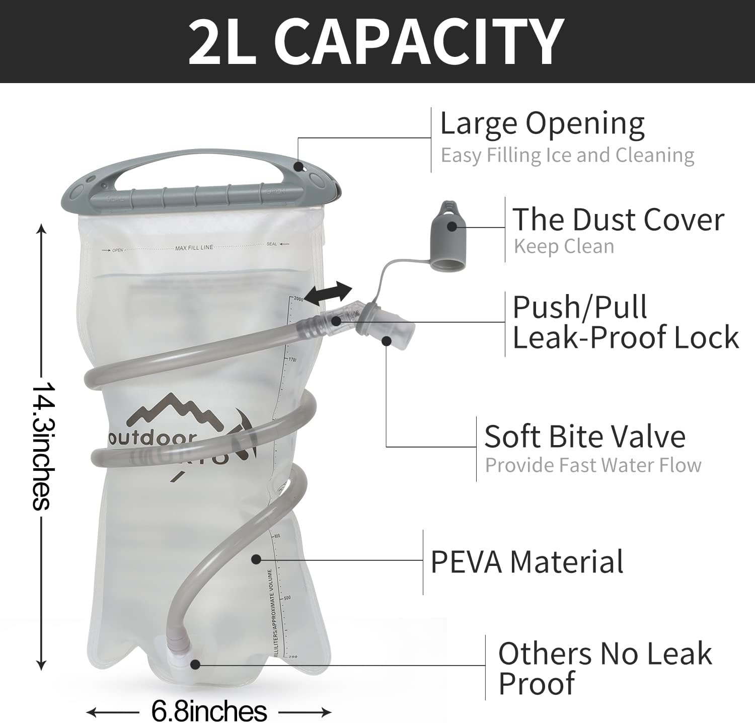 🚴【Premium Quality Water Bladder】The free 2 liter food grade hydration water bladder + two 250ml soft kettle, which can fill water and ice super quickly, It sturdy and durable to retain liquids without any leakage. You can go all day with running hydration pack. simultaneously, water tube it is more convenient to clean provides a wholesome flow for easy drinking keeps your water tasting fresh, all day. The water temperature is range -20~+50℃.