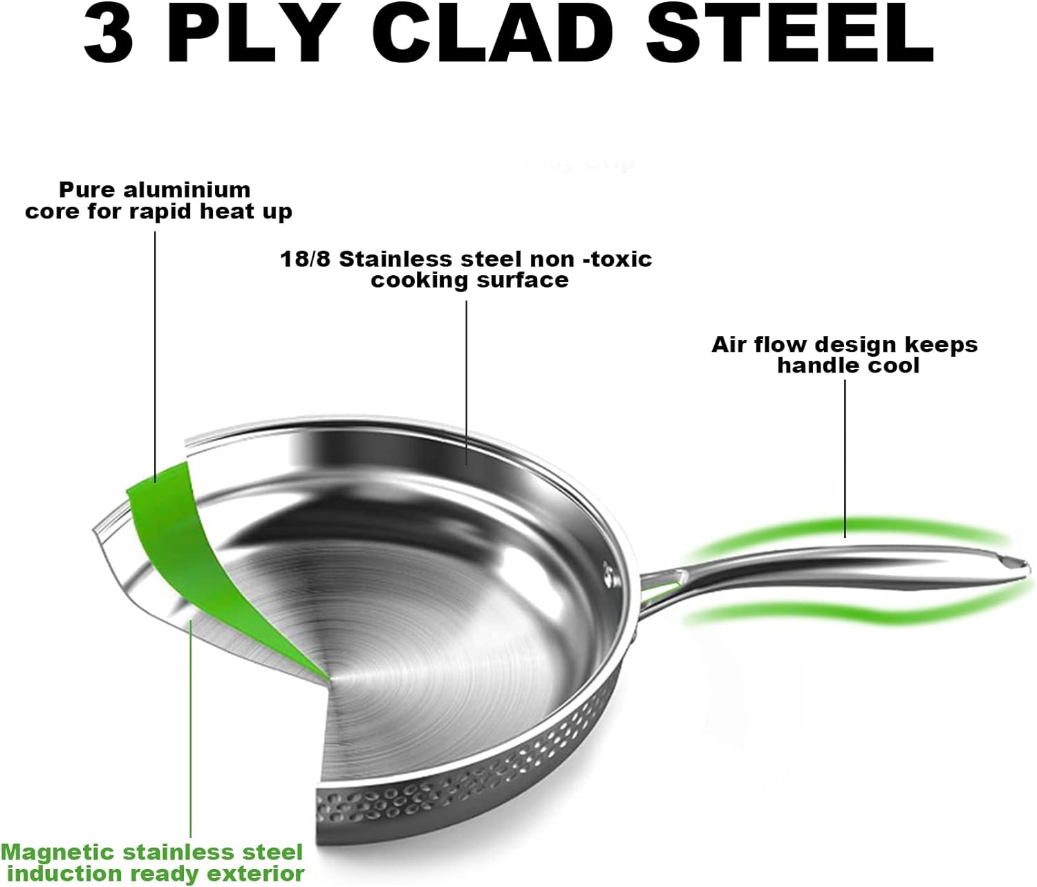 【Durable for Life】Stainless steel – with care will last a lifetime and more. No coating and Non-Toxic, PFOA & PFOS free. You get to escape the potential poisons that come with non-stick pans while learning to become a better cook. Mirror polished and hammered design, which could effectively resists scratches, corrosion, warping and rust. Double riveted handle designed to stay cool during heating, ergonomic design provides a secure grip while cooking.