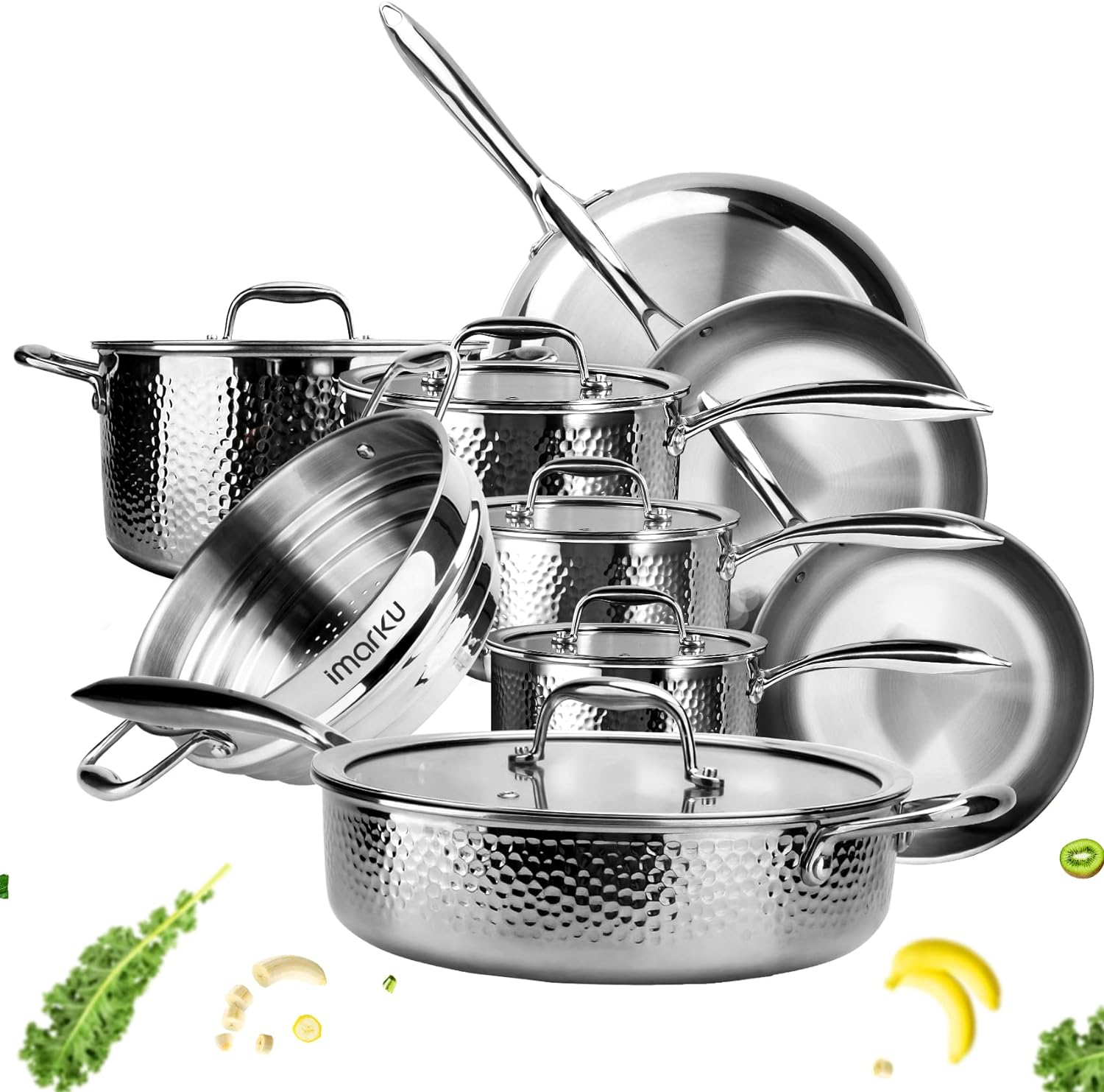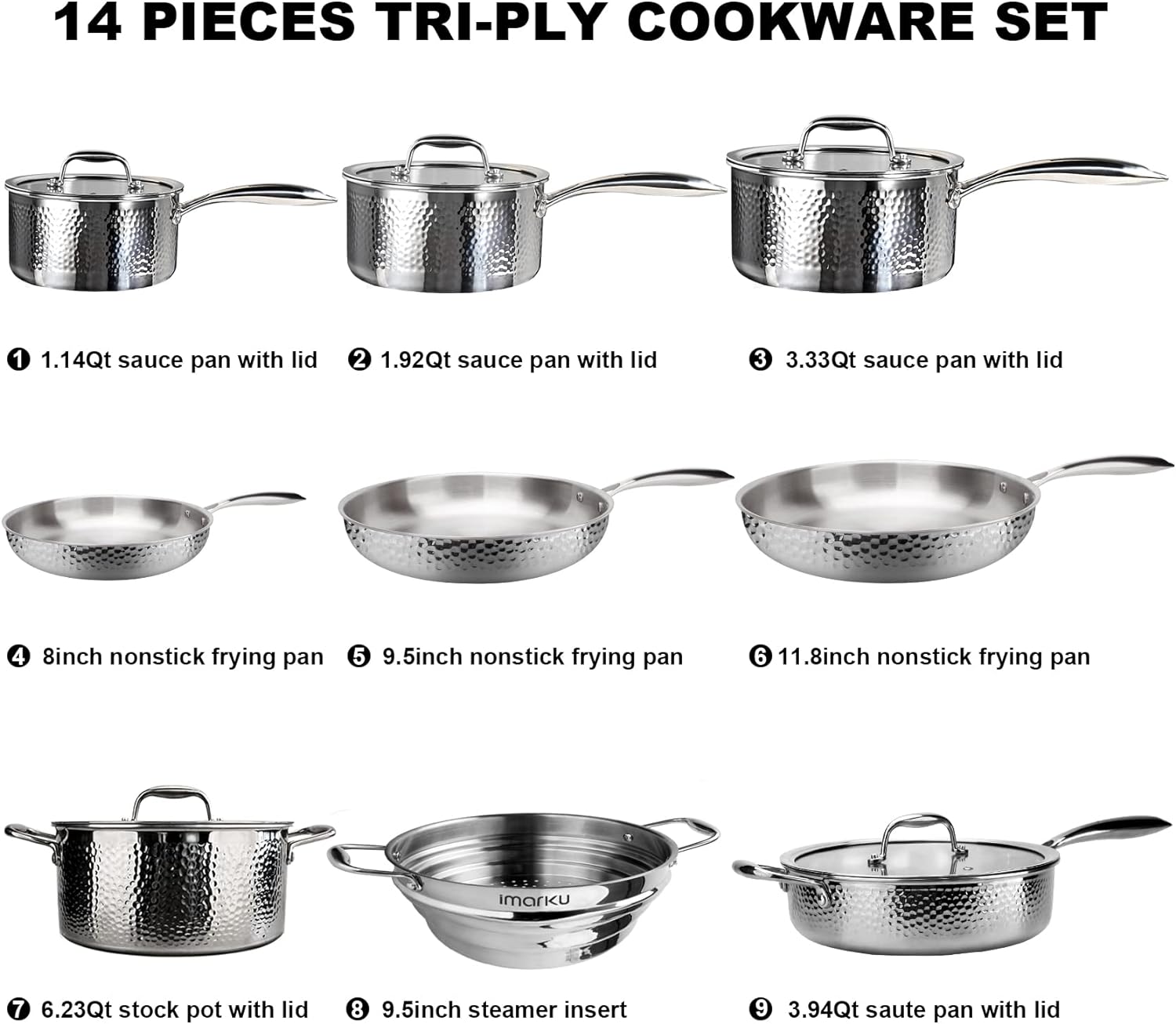 【Set Includes】The stainless steel cookware set includes 8″ frying pan, 9.5″ frying pan, 11.8″ frying pan. 6.23QT stock pot with glass lid, 9.5″ steamer inserts, 3.94QT sauté pan with glass lid. 1.14QT, 1.92QT & 3.33QT saucepans with glass lids. With imarku in the kitchen, you can be confident that your cookware will be beautiful and perform well for a long time.