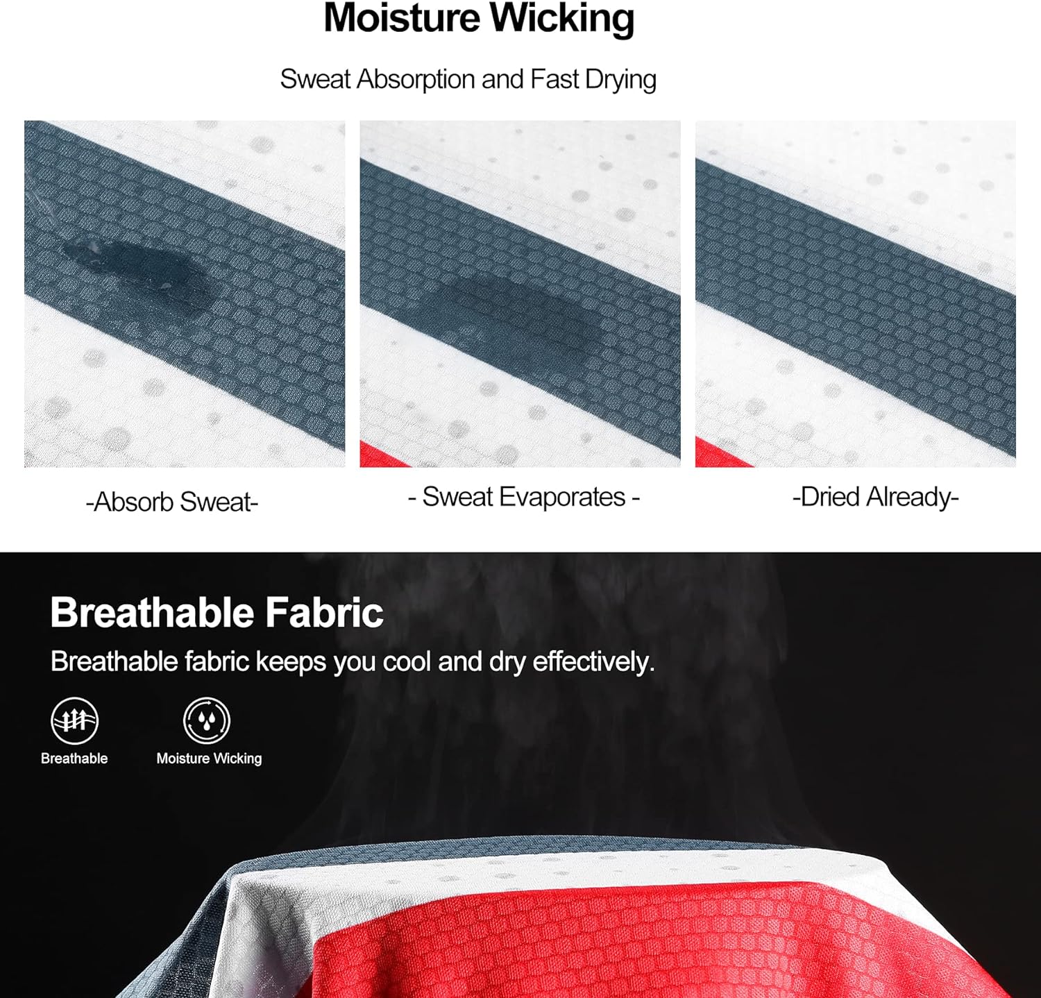 Moisture Wicking: sweat absorption and fast drying. Comfortable skin-friendly breathable fabric keeps you cool and dry effectively.