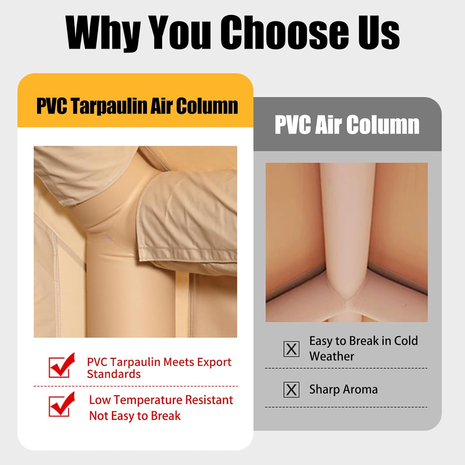 【Easy Installation】The inflatable camping tent does not need manual installation of support rods, and it has TPU inflatable pillars. Equipped with a manual hand pump, then you can finish assembling the camping tent in only 5 minutes.Equipped with durable steel nails and metal windproof rope make the tent more stable. Make your camping trip more enjoyable and comfortable.
