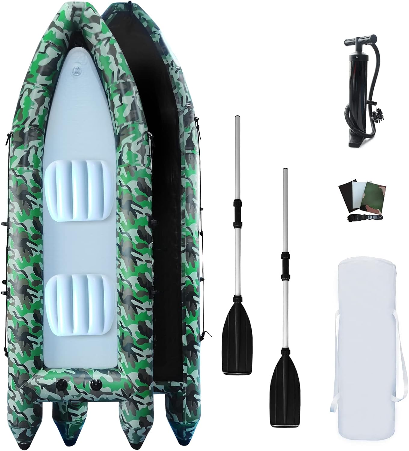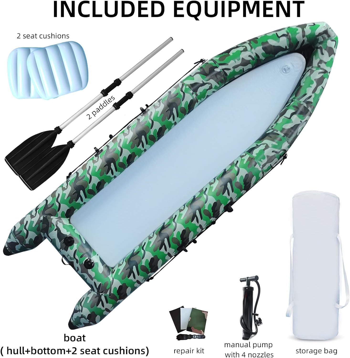 【Package List】2-person inflatable raft boat* 1pc, super tough inflatable bottom* 1pc, inflation cushion* 2pc, paddles* 2pc, manual air pump(with five detachable air nozzles)* 1pc, portable carry bag* 1pc,repair kit(1 inflation port wrench, 3 repair pieces)* 1pc.