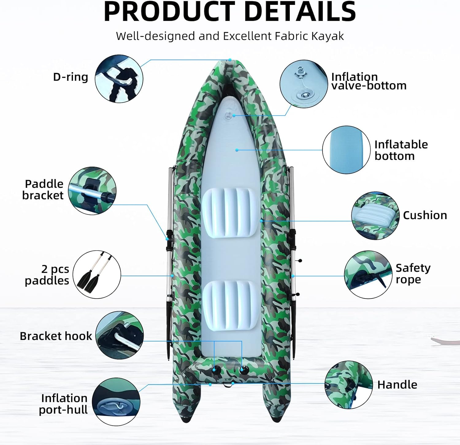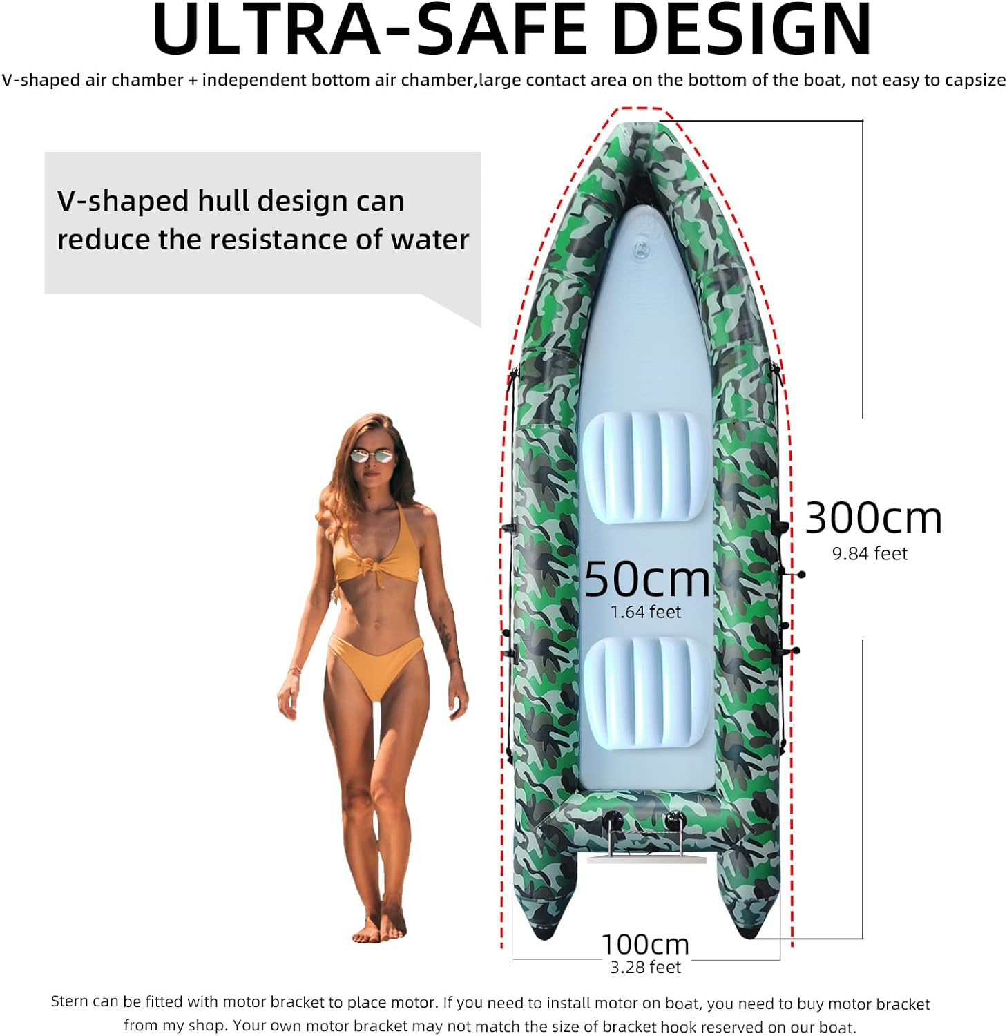 【Easy Installation】The installation of inflatable kayaks is quick and easy, it can be assembled or disassembled within 10 minutes. The weight of the inflatable kayak is about 25.13 lbs, and the kayak can be easily folded and carried after deflating.If you need to mount the motor, please order the outboard motor mount from our store, otherwise it is not applicable because other motors carry motor mounts that do not match our boat’s.