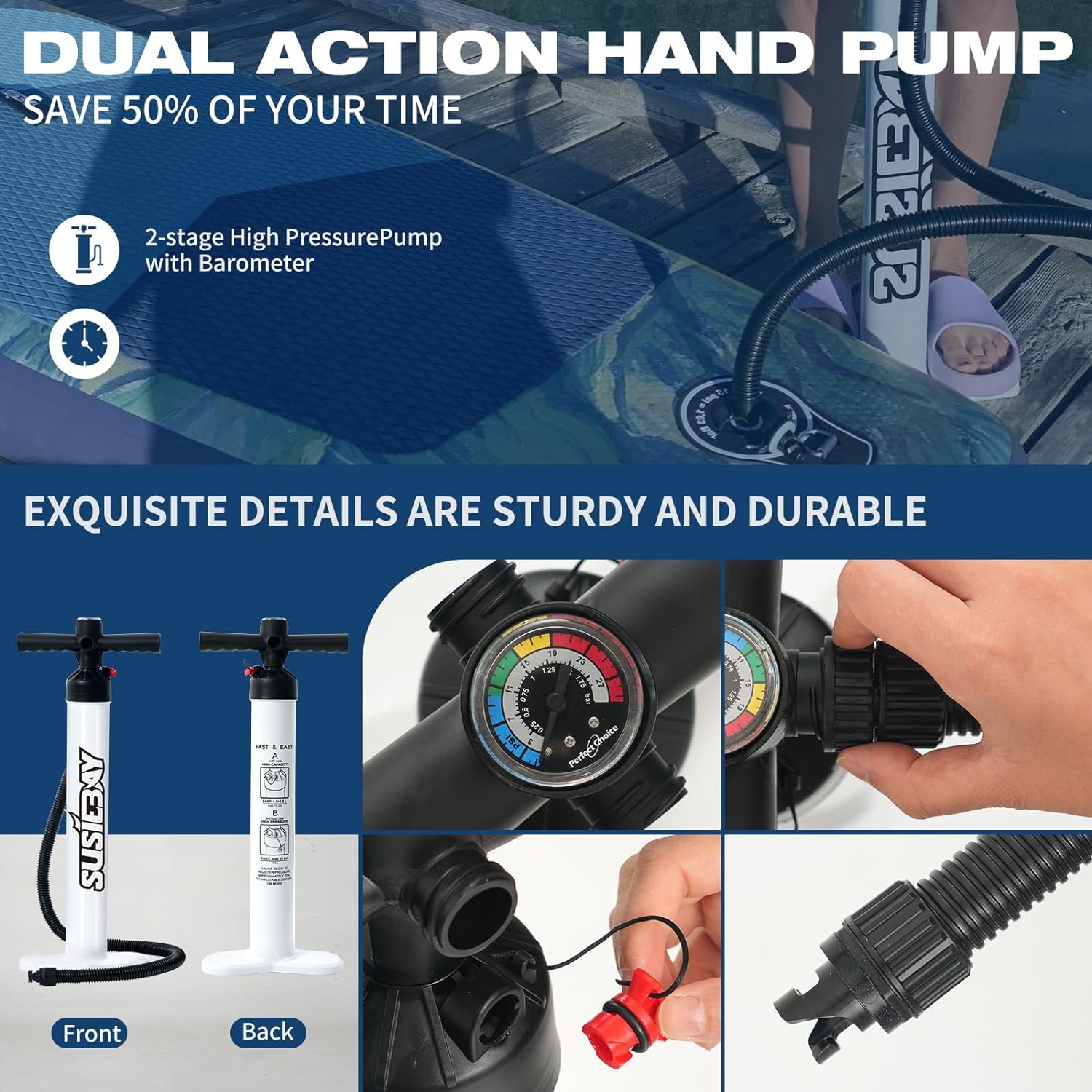 🏄√【SUPER FUNCTIONS】D rings on the paddle board bring extra convenience to carry,also convenient for hanging kettles and other accessories, and you can connect your friend’s SUP boards through them. Hand pump saves you a lot of time, 10 minutes to inflate.