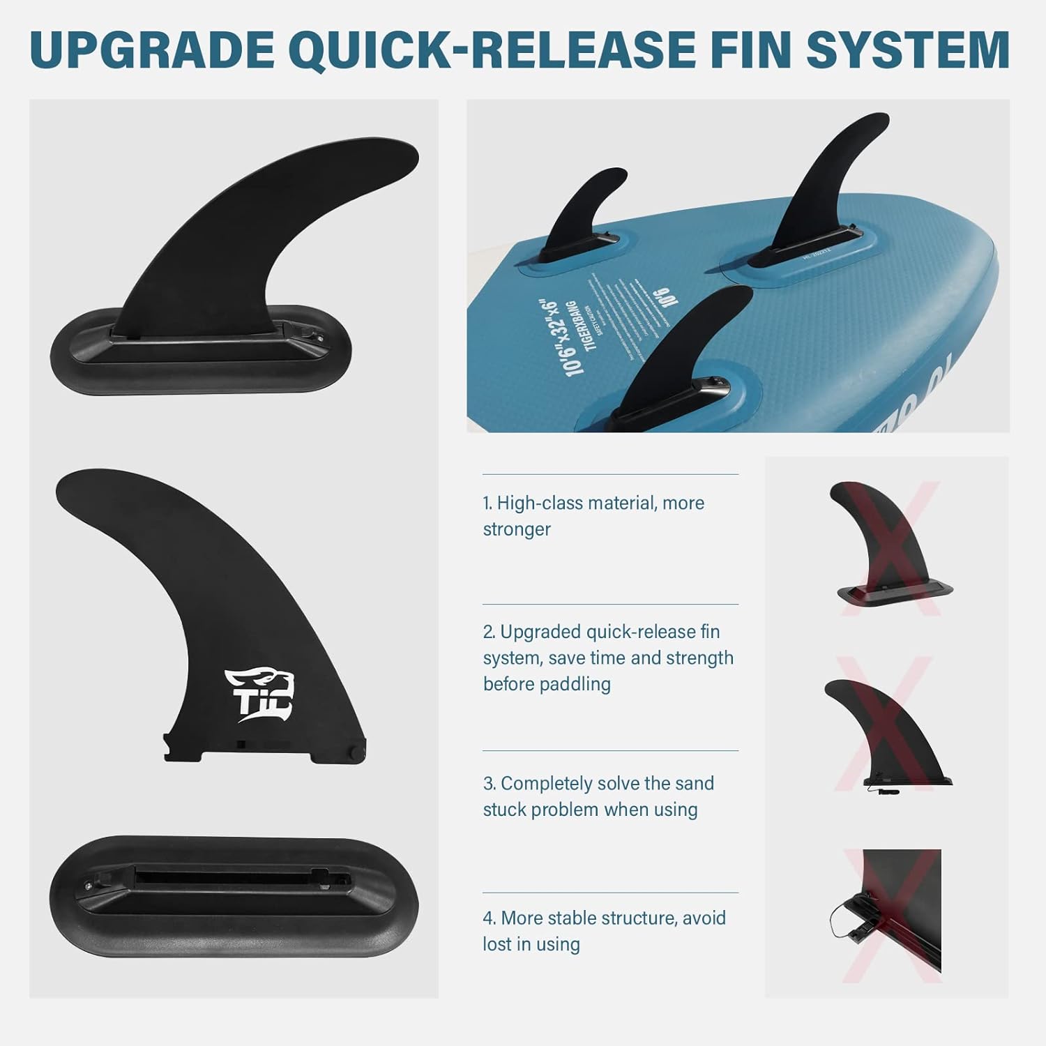 【Quick-Release Fin System】Inflatble Paddleboards come with upgraded quick-release fin system, which more save your time and strength before paddling, solve the sand stuck problem effectively, the paddleboards fins made in high-class material, which more stronger and more stable structure, avoid lost in using.