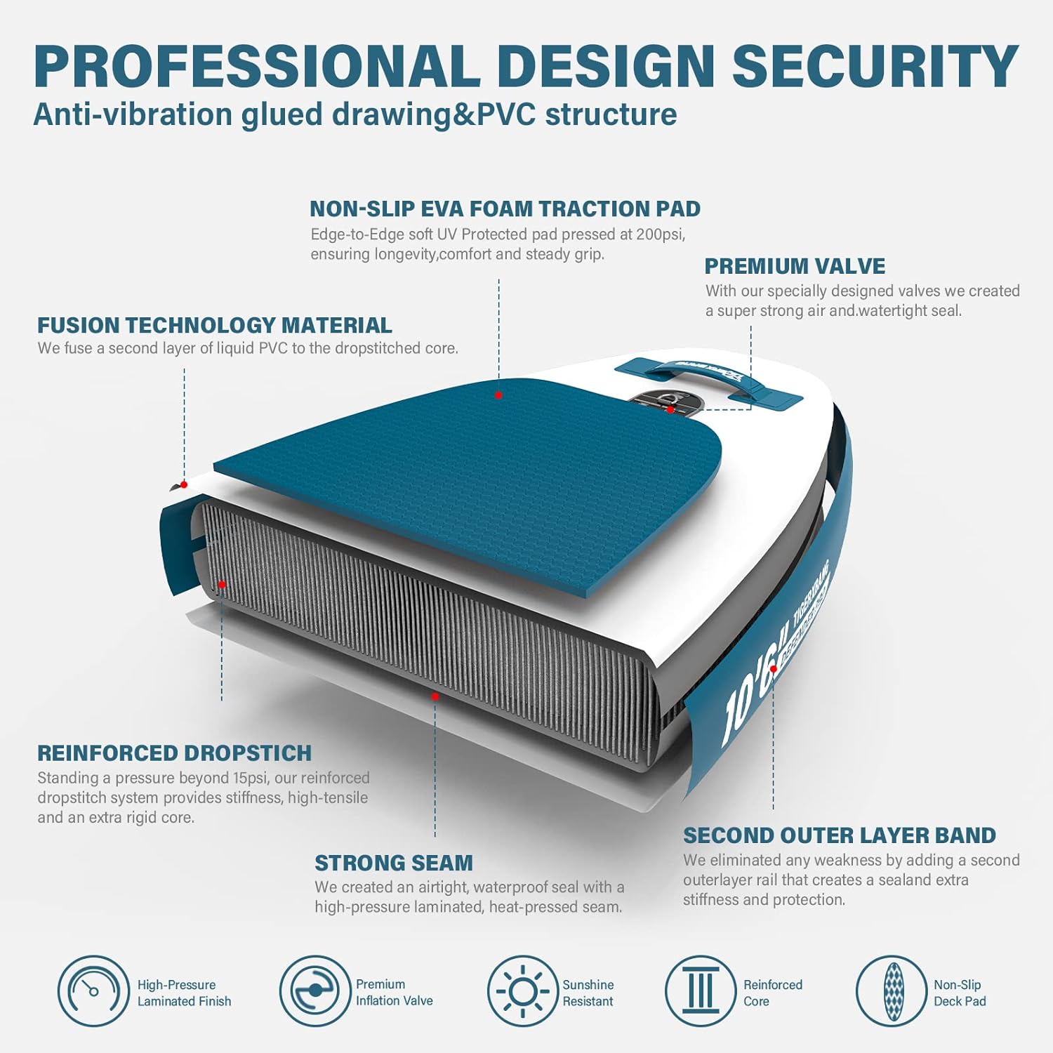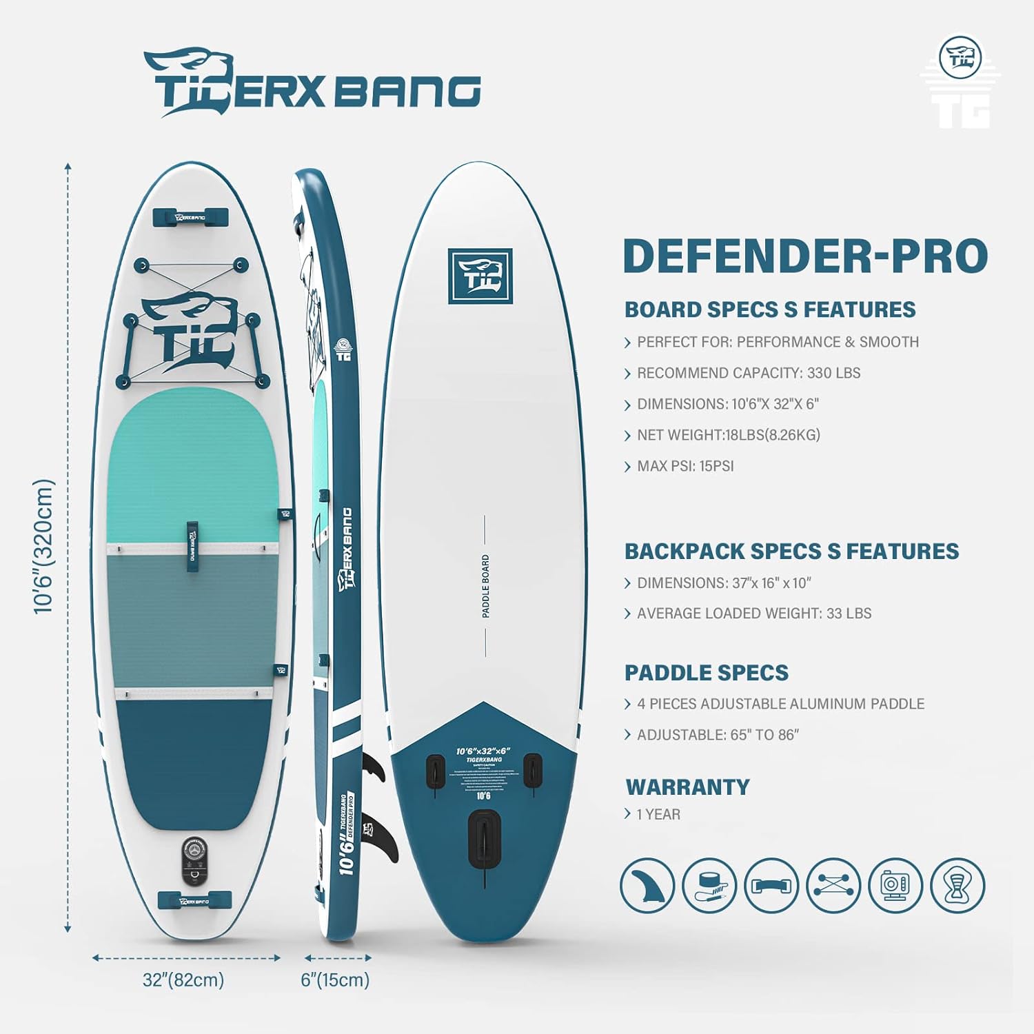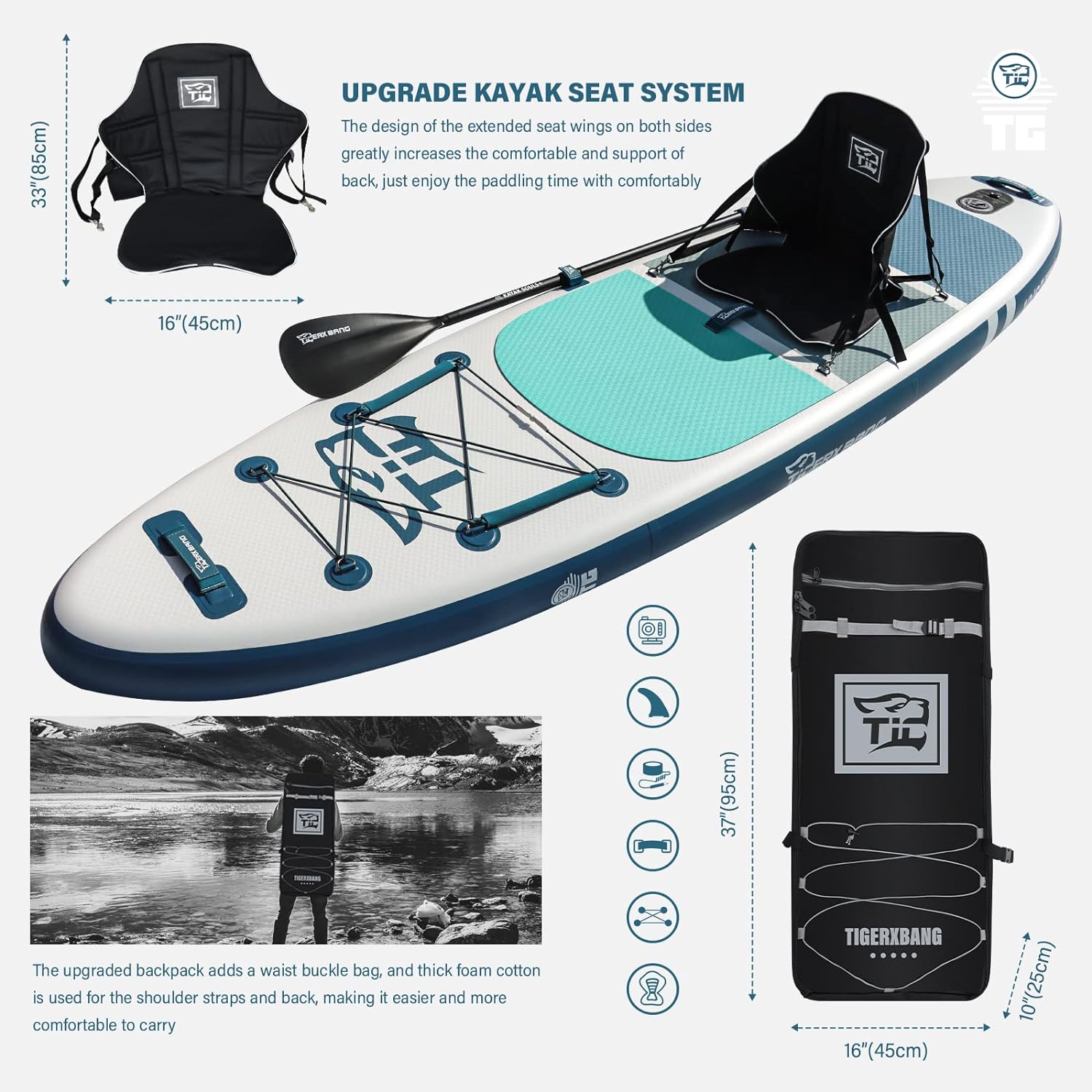 【Military Grade Materials】The TIGERXBANG inflatable paddle boards are made of ultra-light military-grade PVC material which has excellent wear resistance, toughness, and long service life. The 10’6″ x 32″ x 6″ dimensions provide greater buoyancy and sufficient area to support standing or sitting, and won’t deform easily in the water even under heavy load.