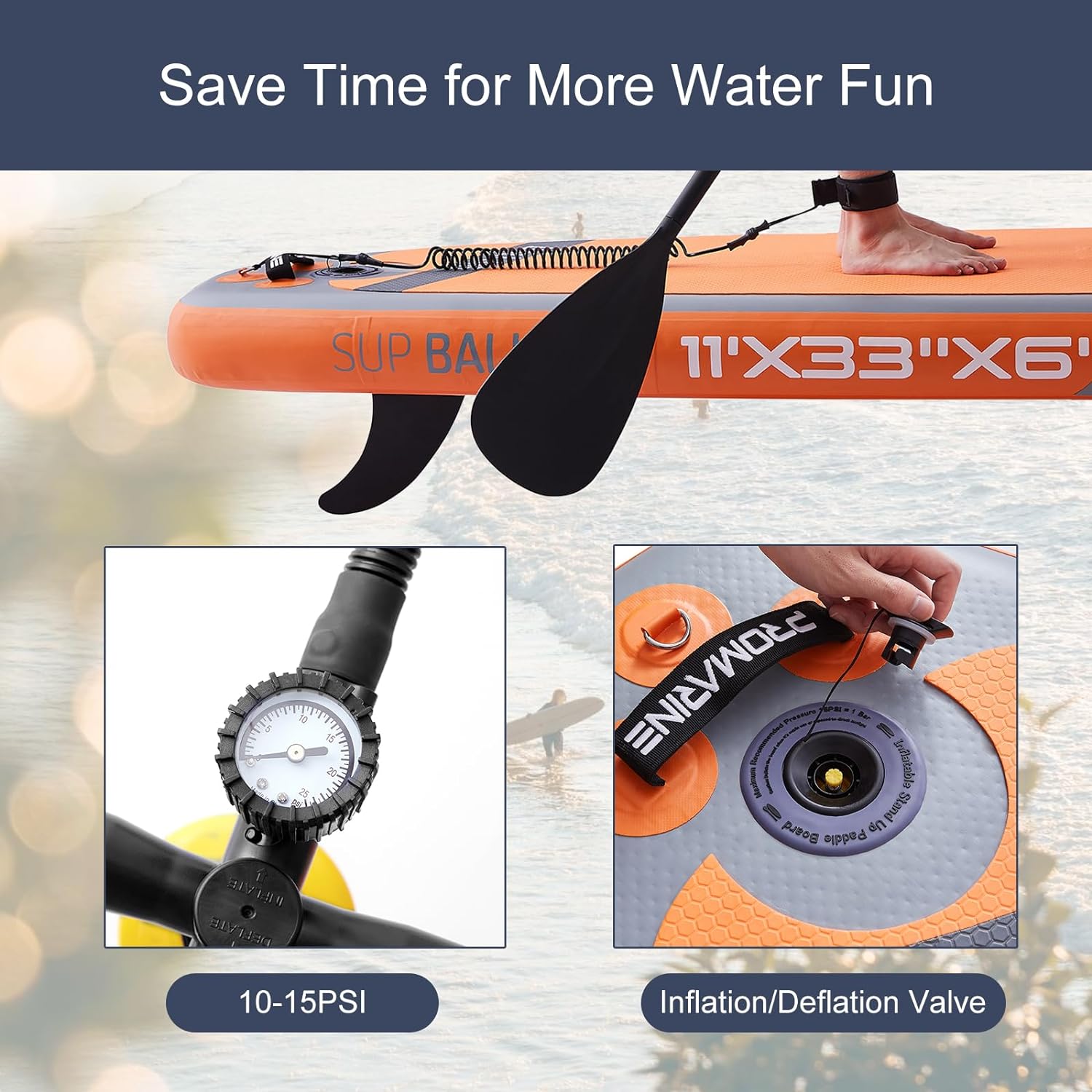 EASY TO STORE: Blow up paddle board includes a dual function pump with pressure gauge for quick inflation, double-headed paddle, double-rope laminate seat, coil leash, waterproof phonecase, emergency repair kits, a travel backpack, shoulder strap, a center fin!