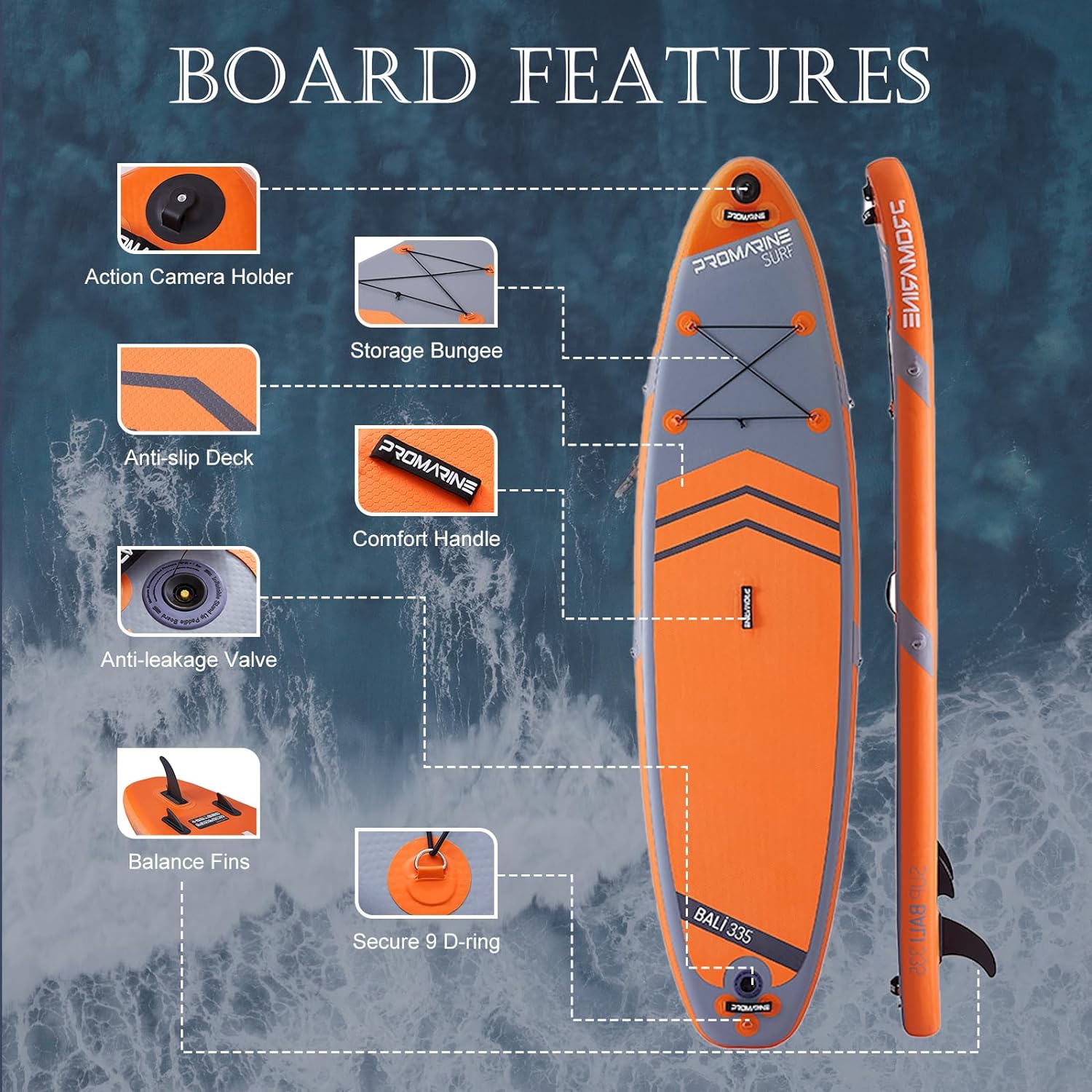 SUPER STABLITY: Inflatable stand up paddle board is made of Military Ultra Light PVC Drop Stitch Fabric, making an incredibly feeling of comfort.Outfitted with a large removable fin and two fixed bottom panel fins, which is more flexible and more convenient to turn. And we provide a replaceable fin for you!