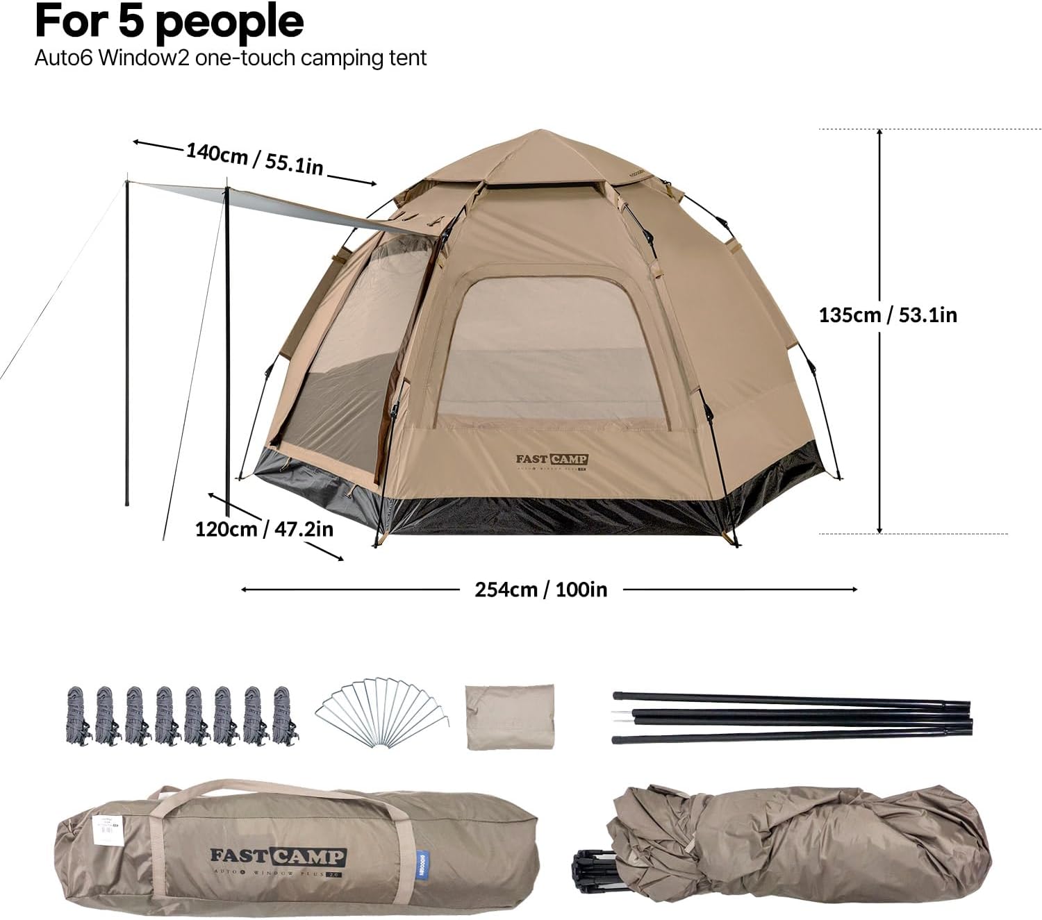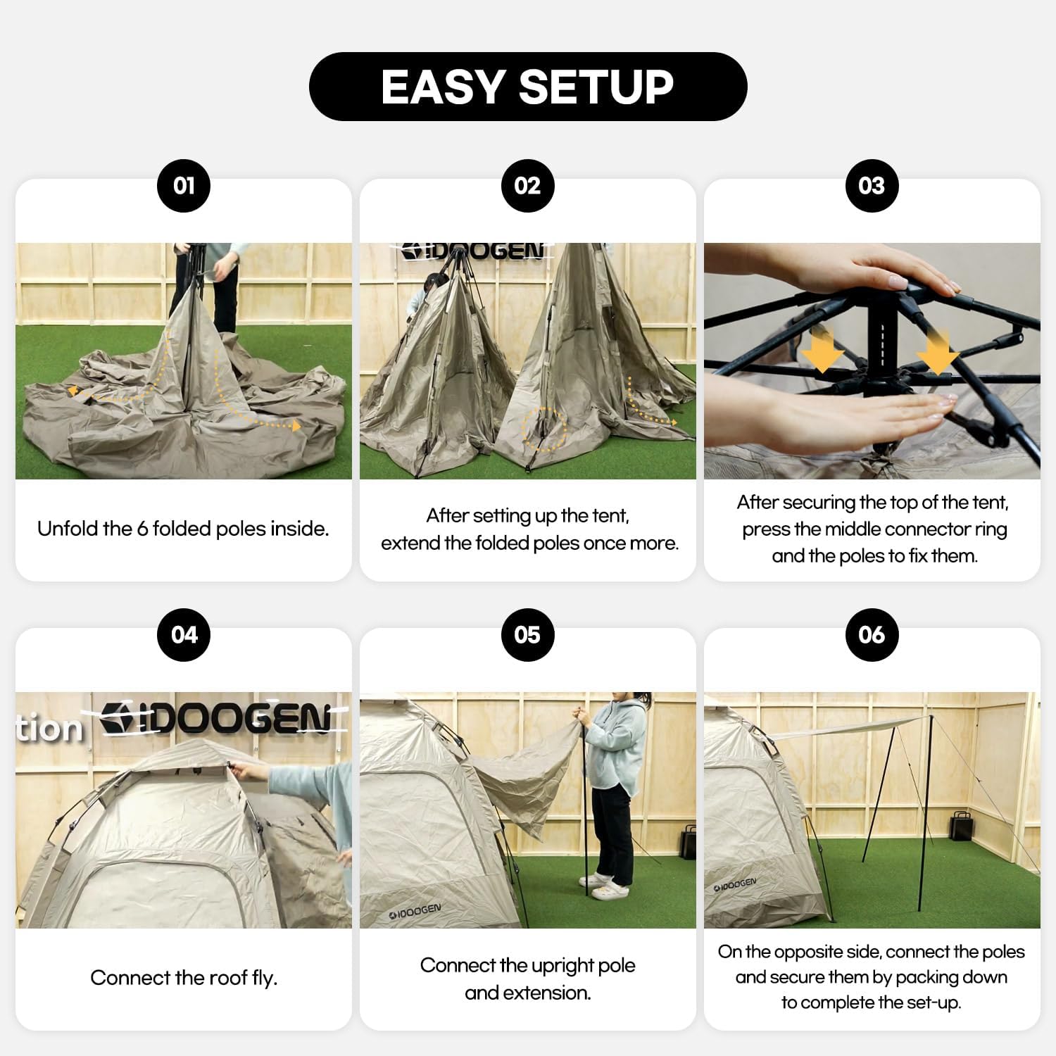 IDOOGEN 4-Person Instant Tent Introducing the IDOOGEN Easy-Up 4-Person Instant Tent, your ultimate camping companion! Effortlessly set up your campsite with our user-friendly design. Simply unpack and lay flat, unfold the poles, and watch as the tent automatically installs itself. Lock the top for added stability, and when it’s time to pack up, our tent conveniently folds down for easy transport. Experience ultimate comfort with our Comfortable Ventilation feature. Equipped with a two-way door, 2 mesh windows, and a top ventilation mesh, our instant tent ensures optimal airflow for a cozy camping experience. The hexagonal design further enhances ventilation, making it perfect for your outdoor adventures. Stay protected from the elements with our Waterproof & Sunproof design. Crafted with PU-coated fabric and sealed seams, our tent offers superior waterproofing. Plus, the interior is treated with a UV silver coating, providing enhanced UV protection and cool shade whenever you need it. Our Dual Breathable Mesh Windows keep insects out while allowing fresh air in. With convenient openings from the inside, these windows enhance ventilation and comfort for your instant camping tents. Lastly, our Spacious 4-Person Tent with Vestibule provides ample room for you and your companions. With size 100*87*53.1inch., our tent’s unique vestibule design offers extra space, privacy, and serves as a sunshade and rain shelter. Elevate your camping experience with the IDOOGEN Easy-Up 4-Person Instant Tent – your perfect companion for outdoor adventures!