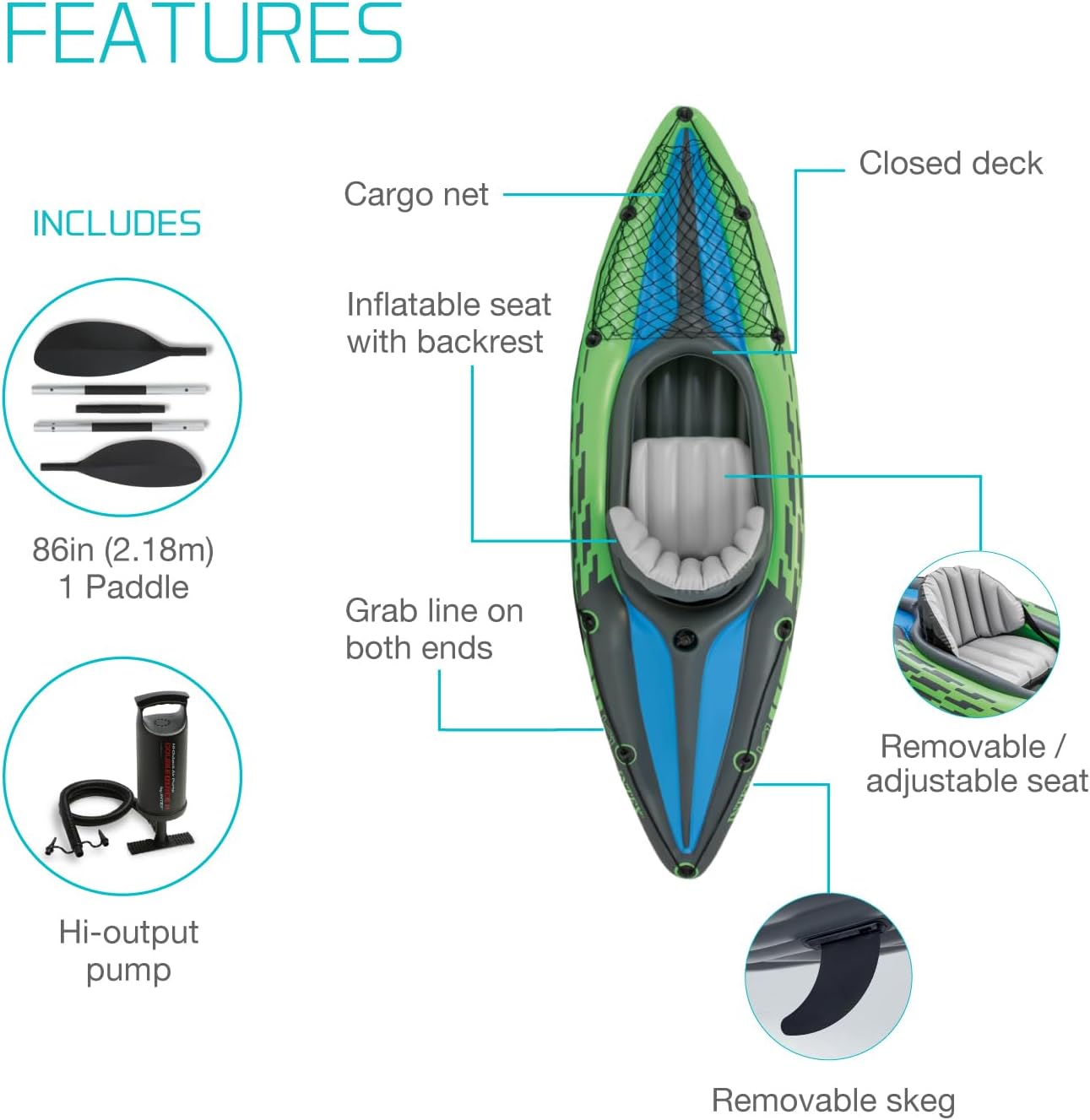 REMOVABLE SKEG – Attached to the underside of the kayak, the removable skeg provides directional stability, making it easier to maintain a straight and steady course while paddling
