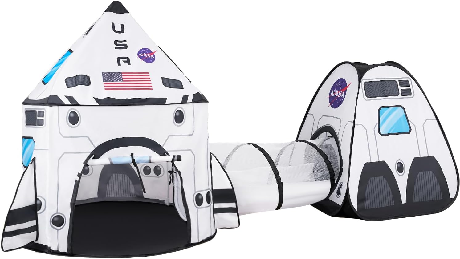 SUPER VALUE. Our play tent and tunnel set features a White Space Designed Tent and the set includes a Tunnel, Cube Play Tent, how-to assemble instruction sheet, and carry tote. This comes as well with 4 pieces Sturdy Poles, Roof and floor anchors.